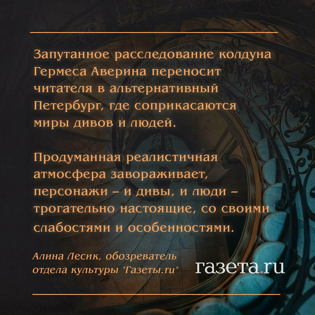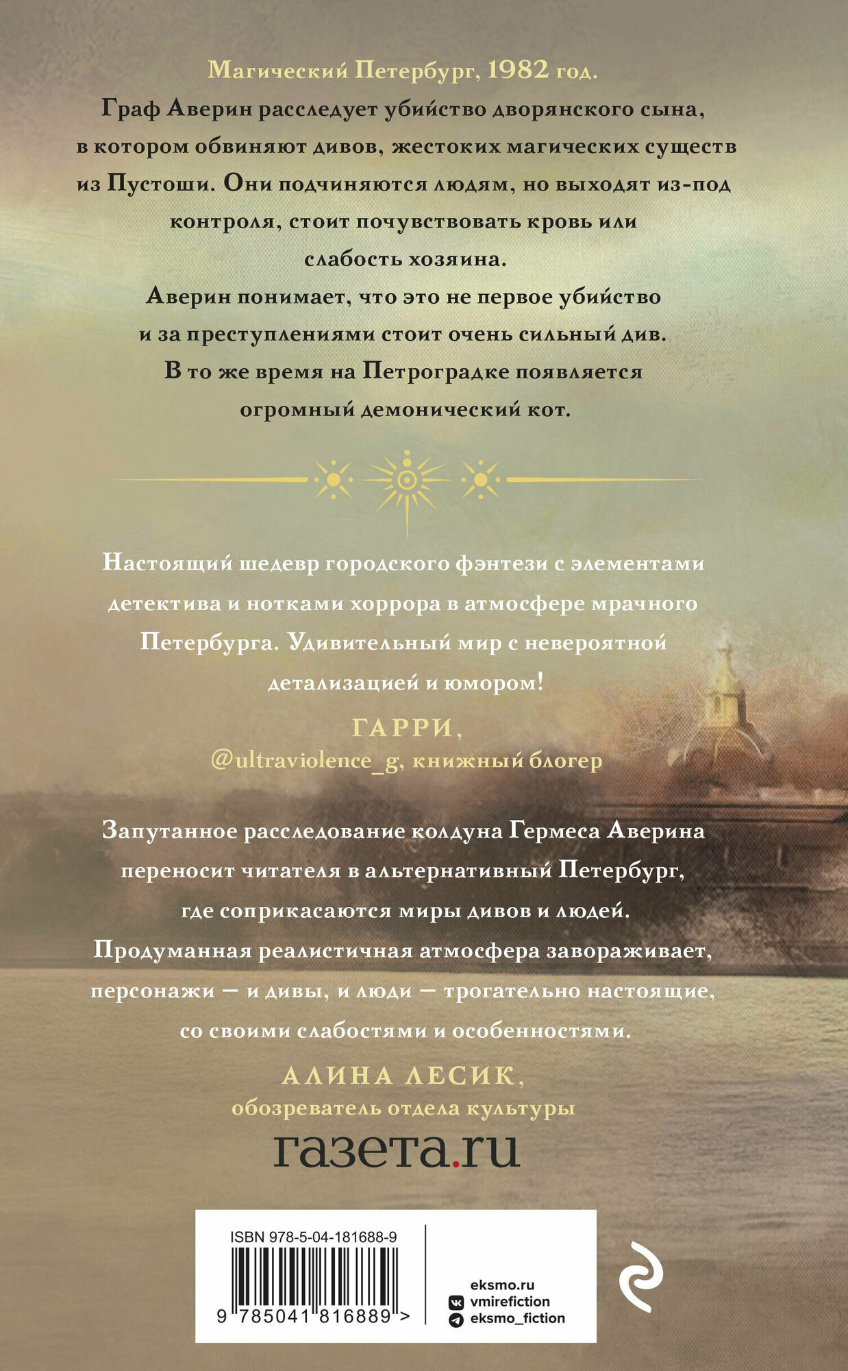 Невероятный роман! Долго ждала его выхода, и все мои высокие ожидания оправдались. Я даже не могу назвать похожий роман, настолько эта история уникальна и атмосферна. Магический Санкт-Петербург, дивы, коты… Читателю ни на секунду не придется заскучать. Путешествие-расследование заведет нас в такие уголки, о которых может знать только настоящий колдун - граф Аверин. Я с огромным удовольствием ознакомилась с первой частью серии и буду ждать остальных. Не каждый день встречается настолько интересный и харизматичный детектив))