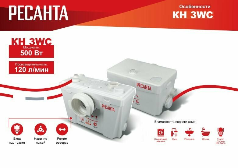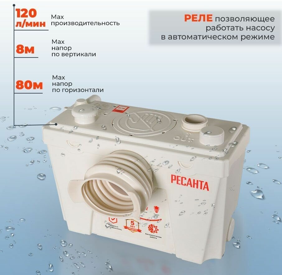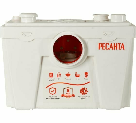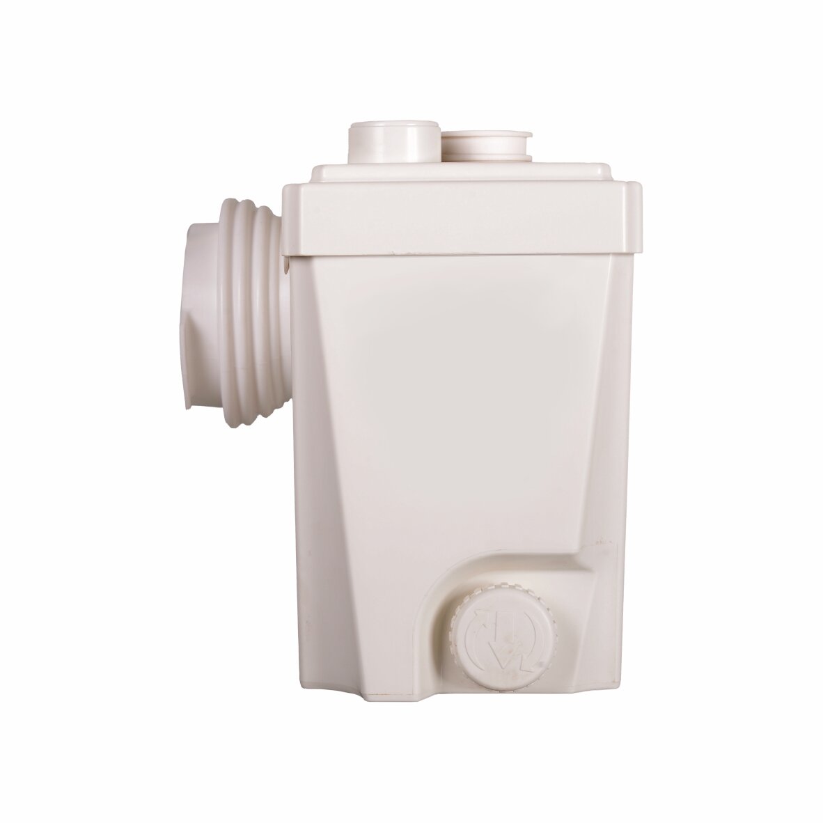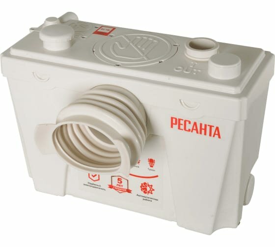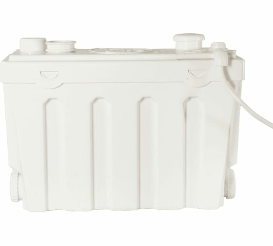 На пластиковом корпусе насоса расположены отверстия для 3-х выходных муфт для отвода воды из умывальника, душа, стиральной машины. В комплекте имеется дополнительная резиновая муфта для подключения к унитазу. Обратный клапан предотвращает попадание жидкости в насосную установку, исключает возникновение неприятного запаха. Автоматический режим работы предусматривает самостоятельный запуск устройства при его наполнении сточными водами. Снижение уровня жидкости до минимального порога приводит к отключению.