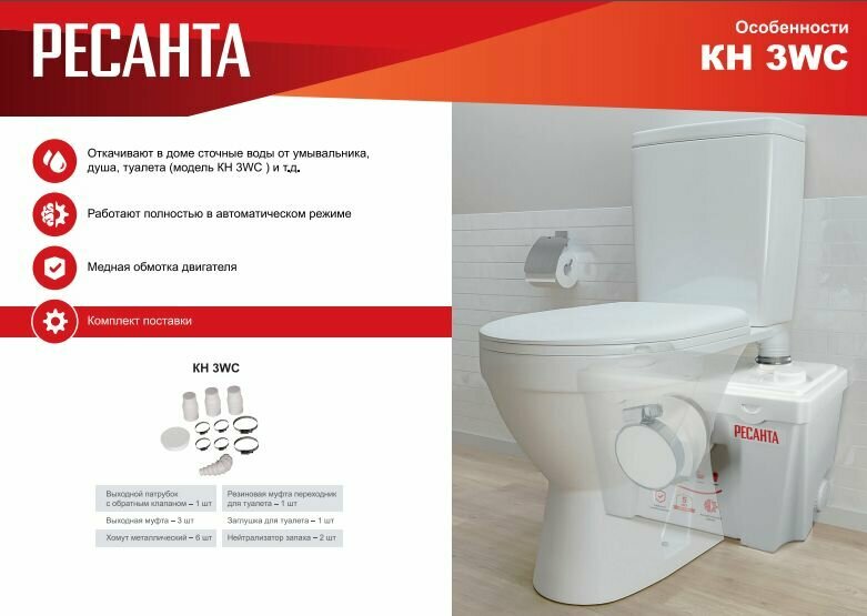 | Комплект поставки | Канализационный насос – 1 шт. Выходной патрубок с обратным клапаном – 1 шт. Выходная муфта – 3 шт. Хомут металлический – 6 шт. Резиновая муфта переходник для туалета – 1 шт. Заглушка для туалета – 1 шт. Нейтрализатор запаха – 2 шт. Паспорт – 1 шт. Упаковка – 1 шт |