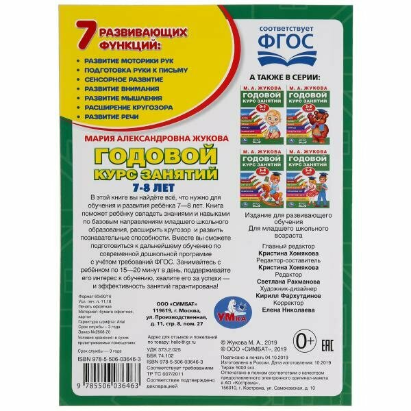Учебное пособие "Годовой курс занятий. 7-8 лет" М.А. Жуковой ТМ "УМка":- соответствует ФГОС- 7 дисциплин- мягкая обложка- красочные иллюстрации.Учебное пособие для малышей поможет ребёнку расширить кругозор, развить познавательные способности, овладеть знаниями и навыками по базовым направлениям дошкольного образования:- чтение- письмо... дальше "- пересказ- грамматика- счёт до 100- память и внимание- математический диктант.У книги "Годовой курс занятий. 7-8 лет" ТМ "УМка" 7 развивающих функций:- развитие моторики рук- подготовка руки к письму- сенсорное развитие- развитие внимания- развитие мышления- расширение кругозора- развитие речи.Подготовьте ребёнка к дальнейшему обучению по современной дошкольной программе." скрыть