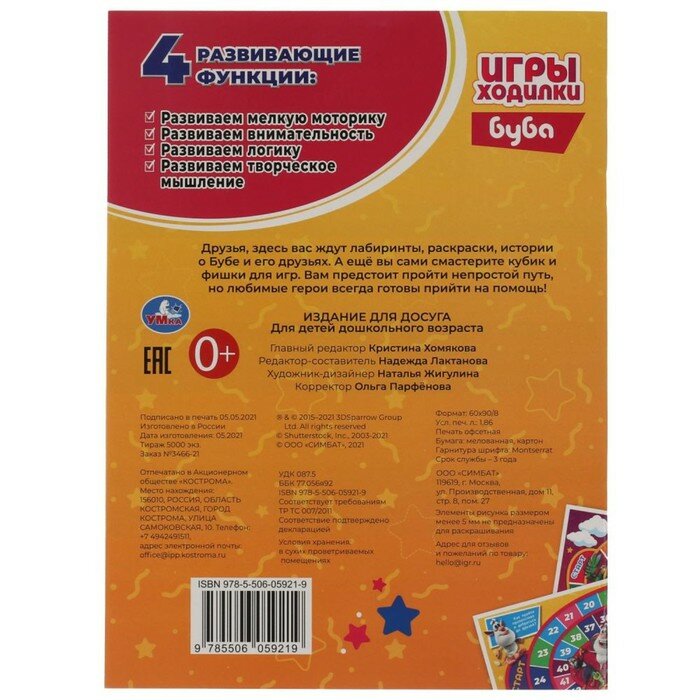 Активити с играми-ходилками «Буба» ТМ «УМка» станет прекрасным подарком для маленького любознайки:- 15 элементов- игры-ходилки- фишки и кубик: вырезай и клей- новые истории- любимые персонажиВ этой книге ребёнок найдёт интересные истории, занимательные задания, увлекательные игры и фишки с изображением любимых мультгероев. Для игры необходимо вырезать кубик, сделать фишки, поставить их на игровое поле – и вперёд за приключениями! Активити имеет удобный формат, поэтому её можно взять с собой в дорогу.Игровые занятия с активити ТМ «УМка» развивают:- мелкую моторику- внимательность- логику- творческое мышлениеОбъём: 12 стр. Формат: 210 х 285 мм.Материал: бумага офсетная.Рекомендовано детям младшего школьного возраста.