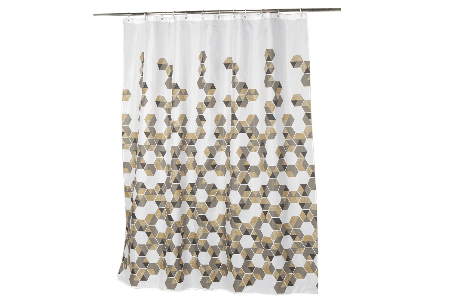 Штора для ванной комнаты изготовлена из полиэстера и предназначена для зонирования места приема ванной или душа. Крепится с помощью пластиковых колец на карнизе или шнуре, закрепляемом между стенами ванной.