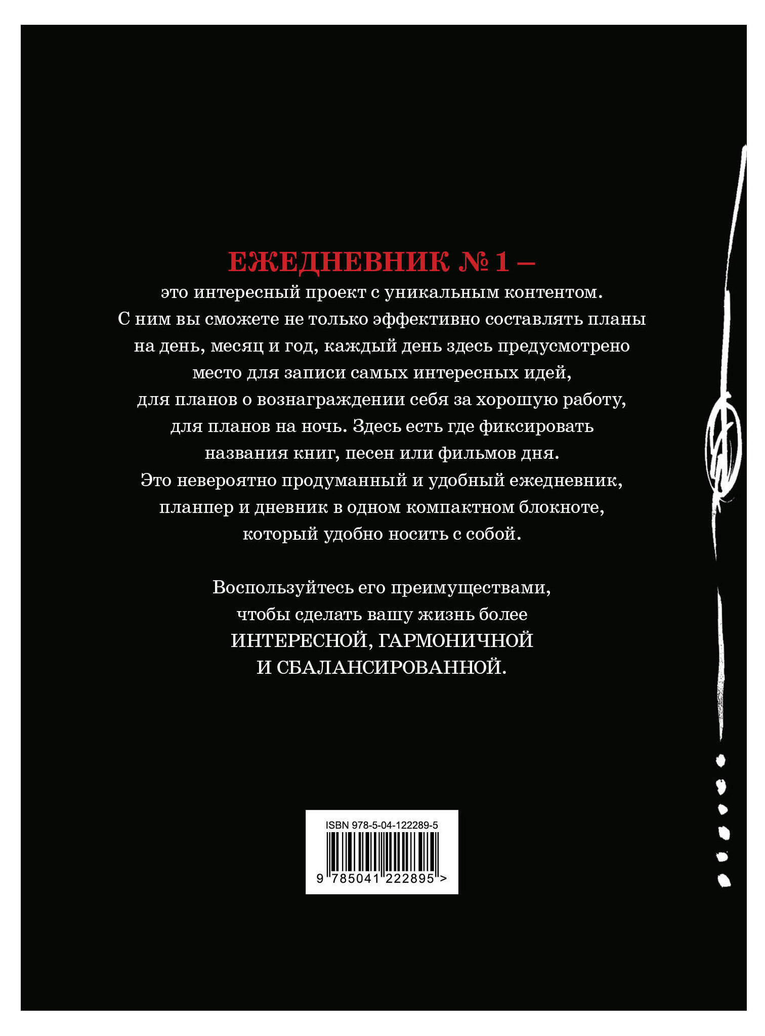 Ежедневник 1 это интересный проект с уникальным контентом. С ним вы сможете не только эффективно составлять планы на день, месяц и год, каждый день здесь предусмотрено место для записи самых интересных идей, для планов о вознаграждении себя за хорошую работу, для планов на ночь. Здесь есть, где фиксировать названия книг, песен или фильмов дня. Это невероятное продуманный и удобный ежедневник, планнер и дневник в одном компактном блокноте, который удобно носить с собой. Воспользуйтесь его преимуществами, чтобы сделать вашу жизнь более интересной, гармоничной и сбалансированной.
