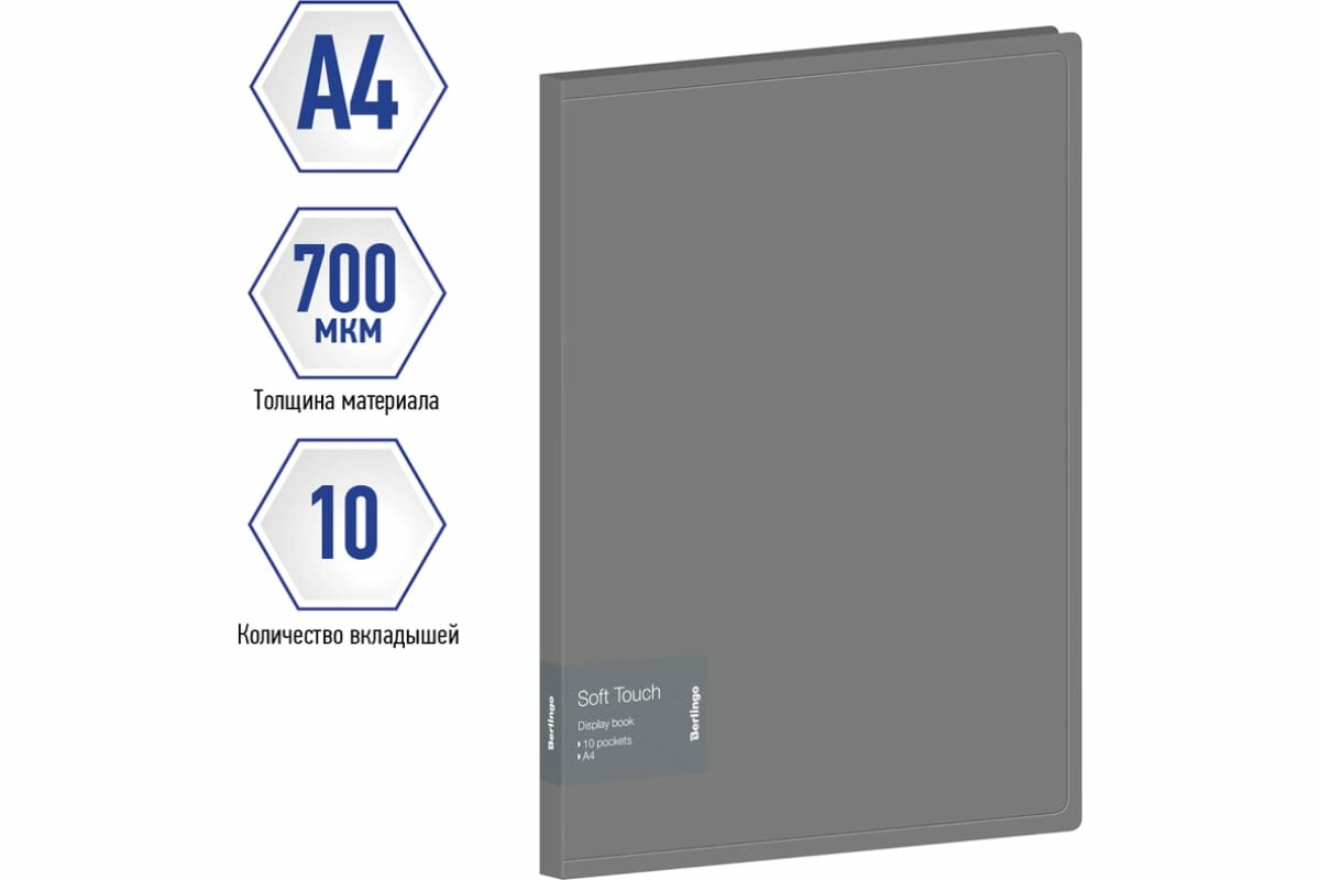 Папка Berlingo серии Soft Touch с 10 вкладышами формата А4 - отличный и стильный помощник для хранения документов с плотной обложкой с приятной софт-тач фактурой. Толщина обложки - 700 мкм. Тип скрепления термосварка. Ширина корешка - 17 мм. Папка изготовлена из высококачественного полипропилена с особой фактурой с эффектом софт-тач. Внутренняя сторона обложки оснащена плотным прозрачным карманом для удобного хранения мелочей: ручки, заметок, визиток, дисков, флешек и др. Папка выполнена в размере 310х233х17 мм. Папка имеет прозрачные фактурные листы-карманы увеличенной толщины 30 мкм, надёжно скреплённые сваркой. Вмещает до 100 бумажных листов.