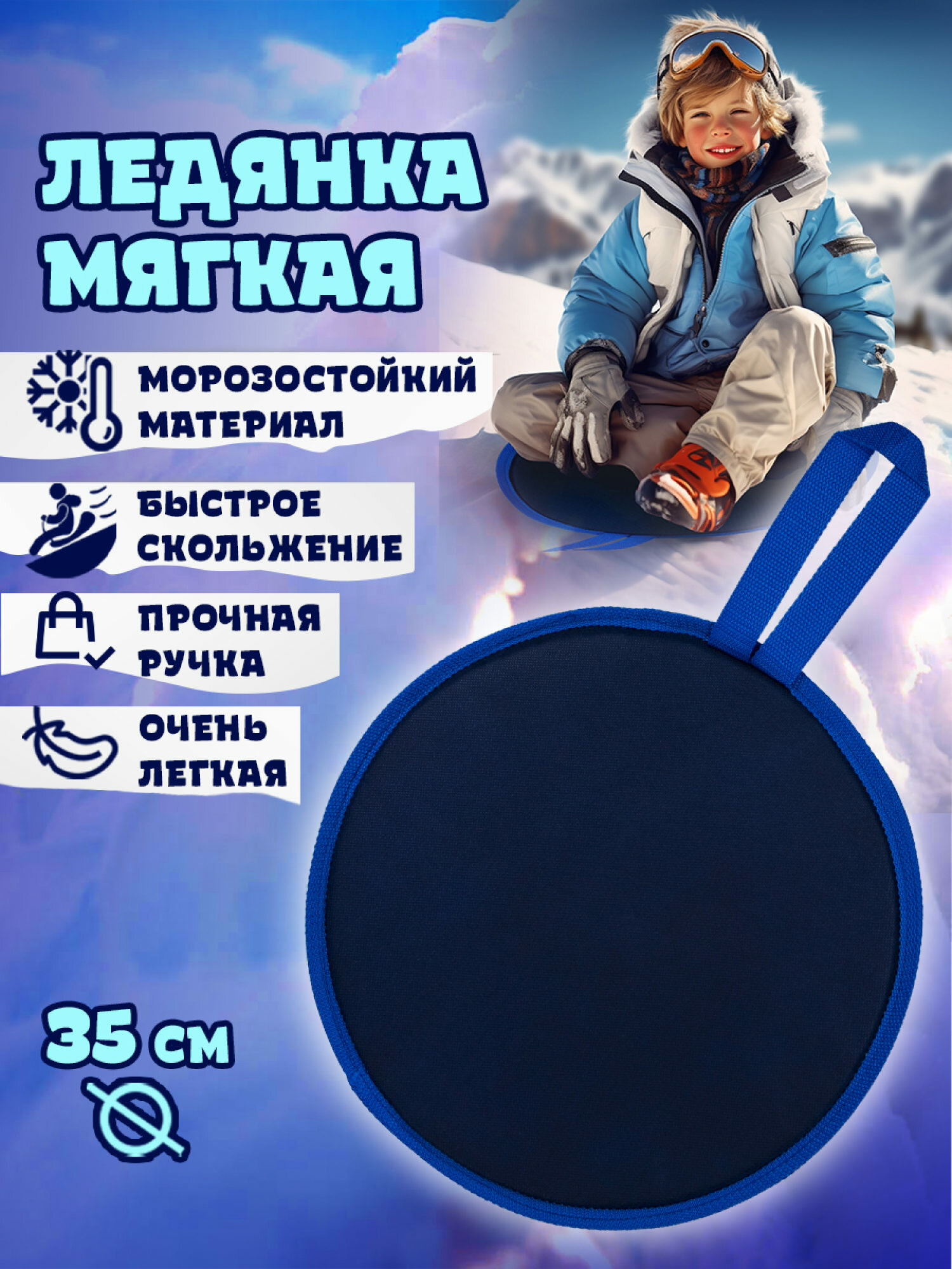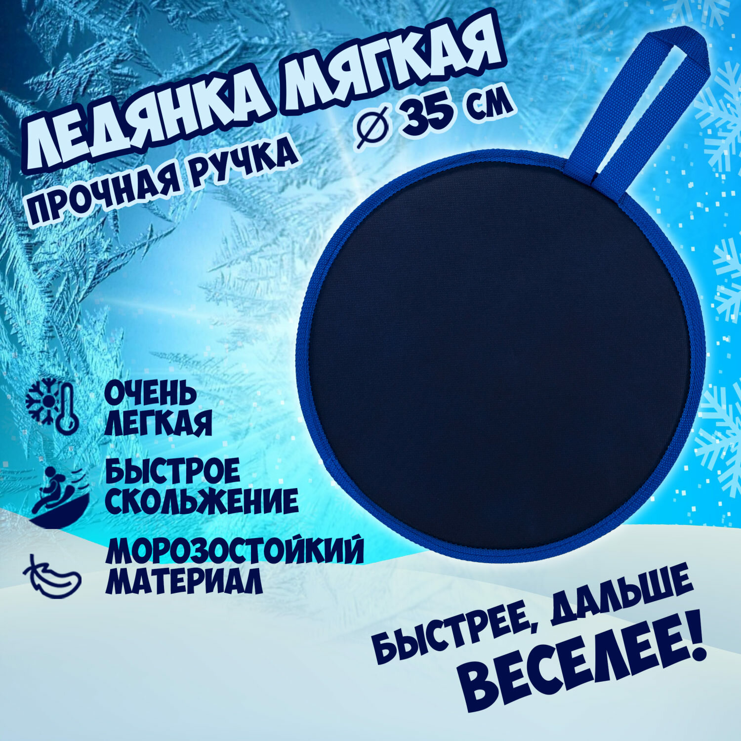 Ледянки - это простое приспособление для катаний с горок. Данная модель имеет круглую форму с диаметром 35 см. Для безопасности и удобства катания предусмотрена ручка спереди. Ледянка выполнена из водостойких и устойчивых к морозам материалов. Она отлично держит форму и не деформируется во время катания.
