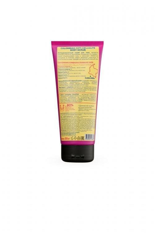 Антицеллюлитный скраб для тела является важным этапом в программе похудения! Он превосходно отшелушивает кожу и запускает обменные процессы в клетках, дарит видимую упругость и эластичность коже, придаёт ей здоровый ровный цвет. Программа совершенствования тела 1. COLOMBIAN ANTI-CELLULITE BODY SCRUB (2-3 раза в неделю) 2. MOROCCAN THERMAL BODY MASK (1-2 раза в неделю) 3. JAPANESE SLIMMING SHOWER GEL (каждый день) 4. SICILIAN LIPOLYTIC BODY GEL (каждый день) 5. BRAZILIAN SLIMMING BODY CREAM (каждый день) Картинки-карта Колумбия, схематично женский силуэт. Колумбийский черный кофе содержит рекордное количество природного кофеина, который стимулирует обмен веществ, выводит токсины, способствует моделированию фигуры. Экстракт гуараны является мощнейшим тонизирующим компонентом, ускоряет обменные процессы, выводит токсины и лишнюю воду из организма, избавляет от лишних сантиметров. +Slim complex SimFit - активный компонент с доказанной эффективностью, мощный стимулятор липолиза, направлен на устранение видимых признаков целлюлита и замедление образования новых жировых клеток на 80%. Заметно улучшает текстуру и внешний вид кожи.