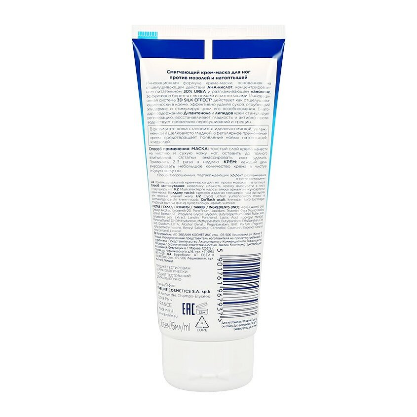 Мгновенное разглаживание, 100% гладкая и мягкая кожа ног. Инновационная формула крема-маски, основанная на отшелушивающем действии AHA-кислот, концентрированном питательном 30% UREA и разглаживающем ланолине, эффективно борется с мозолями и натоптышами. Инновационная система 3D SILK EFFECT действует как отшелушивающие носки в креме, эффективно удаляя сухой, огрубевший эпидермис и стимулируя цикл его возобновления. Благодаря содержанию Д-пантенола и липидов крем стимулирует регенерацию, восстанавливает гладкость и активно противодействует появлению пересушиваний и трещин. В результате кожа становится идеально мягкой, увлажненной и шелковисто гладкой, а регулярное применение крема предотвращает появление новых натоптышей и мозолей.