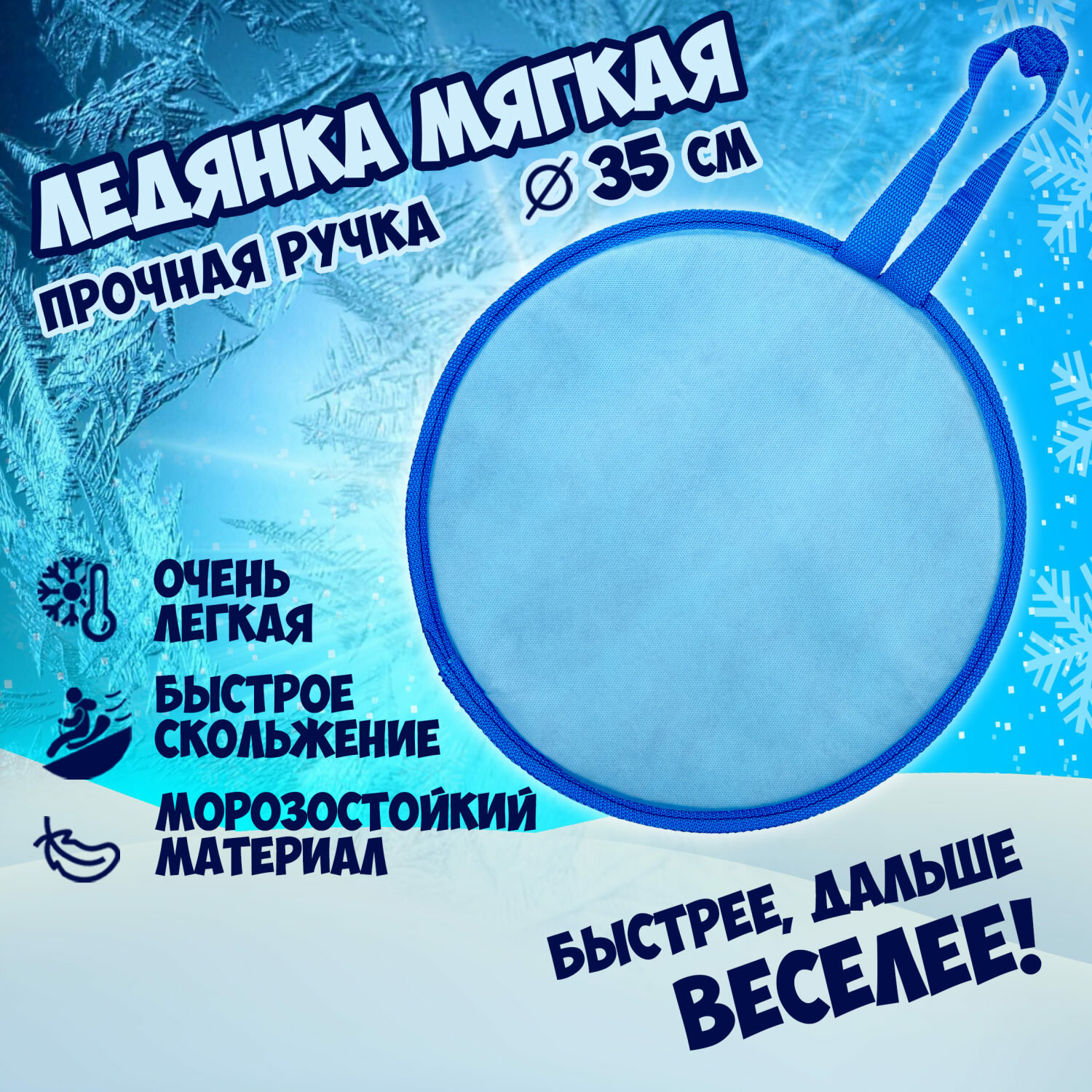 Ледянки - это простое приспособление для катаний с горок. Данная модель имеет круглую форму с диаметром 35 см. Для безопасности и удобства катания предусмотрена ручка спереди. Ледянка выполнена из водостойких и устойчивых к морозам материалов. Она отлично держит форму и не деформируется во время катания.
