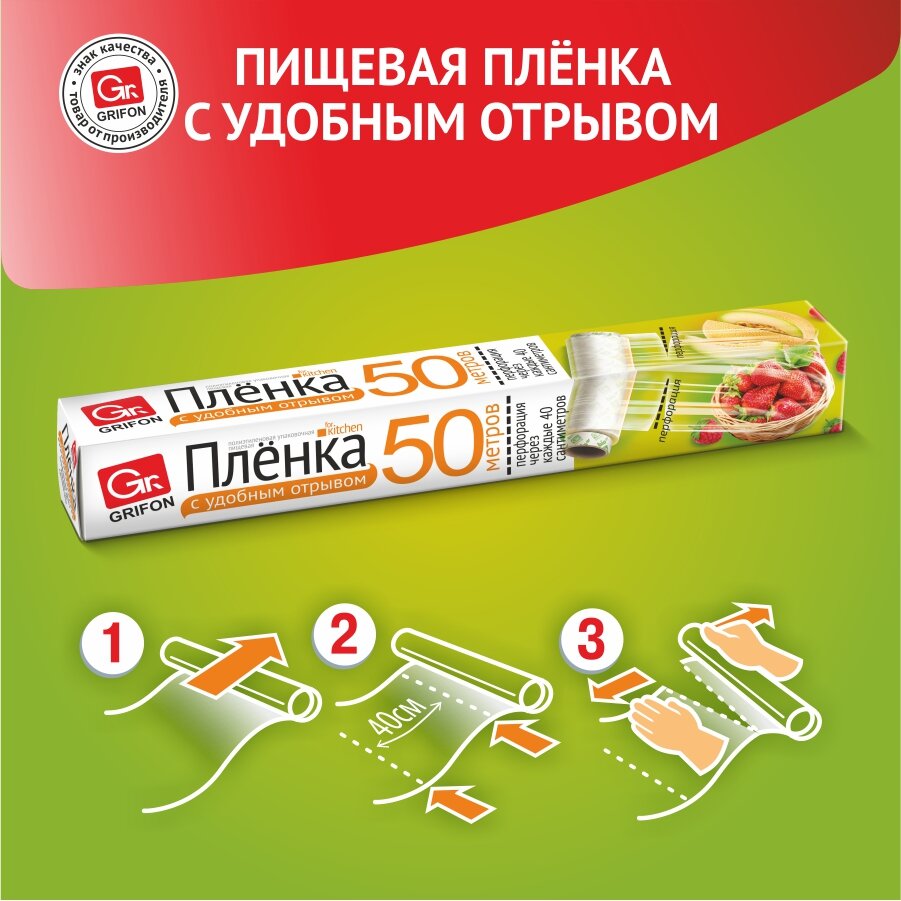 К ее очевидным преимуществам можно отнести прочность, перфорацию в зоне отрыва, хорошую растяжимость и газопроницаемость. Пленка позволяет пропускать кислород, а наружу выпускать углекислый газ, именно поэтому внутри не накапливается конденсат. Благодаря барьерным свойствам пищевая пленка GRIFON продлевает срок хранения продуктов и они дольше остаются свежими.