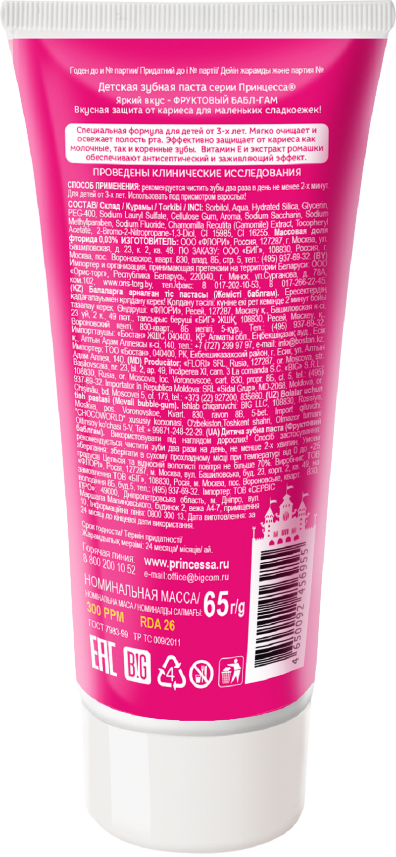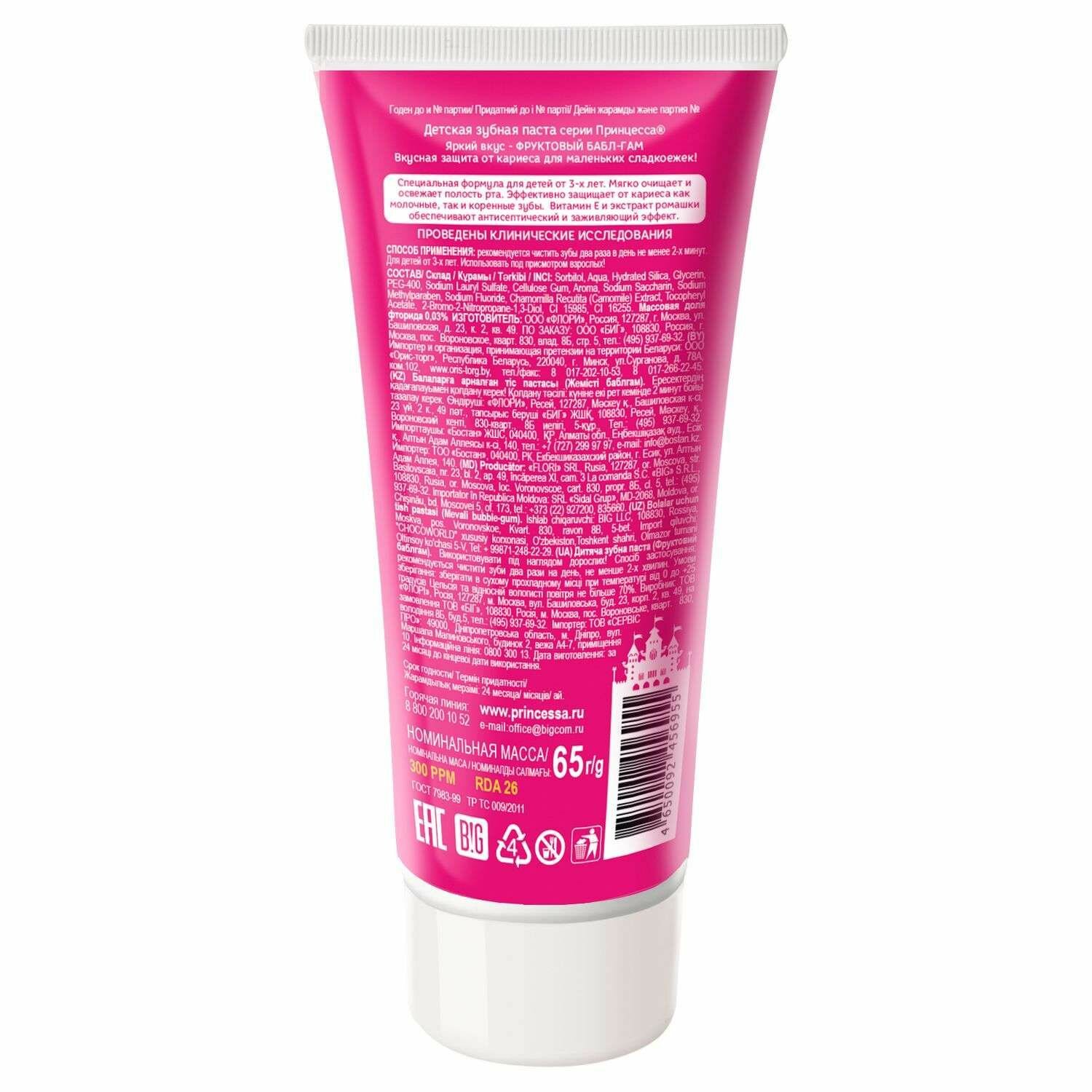 Зубная паста детская Принцесса Фруктовый бабл-гам 65 г