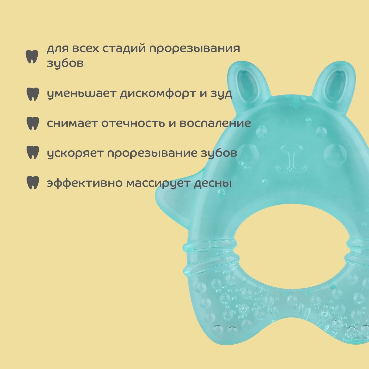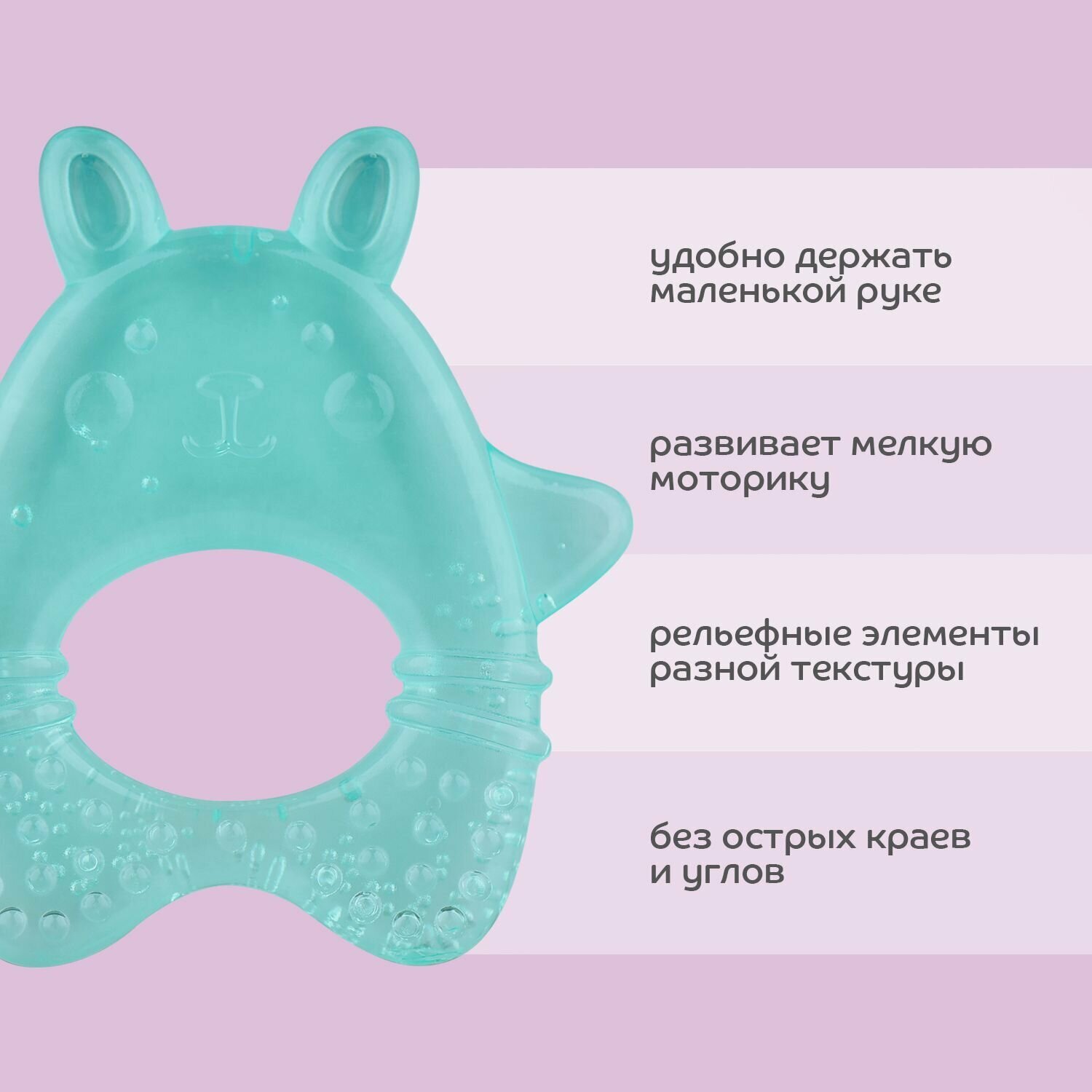 Прорезыватель в виде забавного зайчонка поможет уменьшить неприятные ощущения во время прорезывания зубов. Малыш с удовольствием будет использовать прорезыватель, одновременно играя. Благодаря текстурированной поверхности создается массажный эффект, успокаивающий раздражение. Удобные ушки и лапки зайчика помогут прорезаться даже труднодоступным зубкам. Удобно ложится в маленькую ручку ребенка.