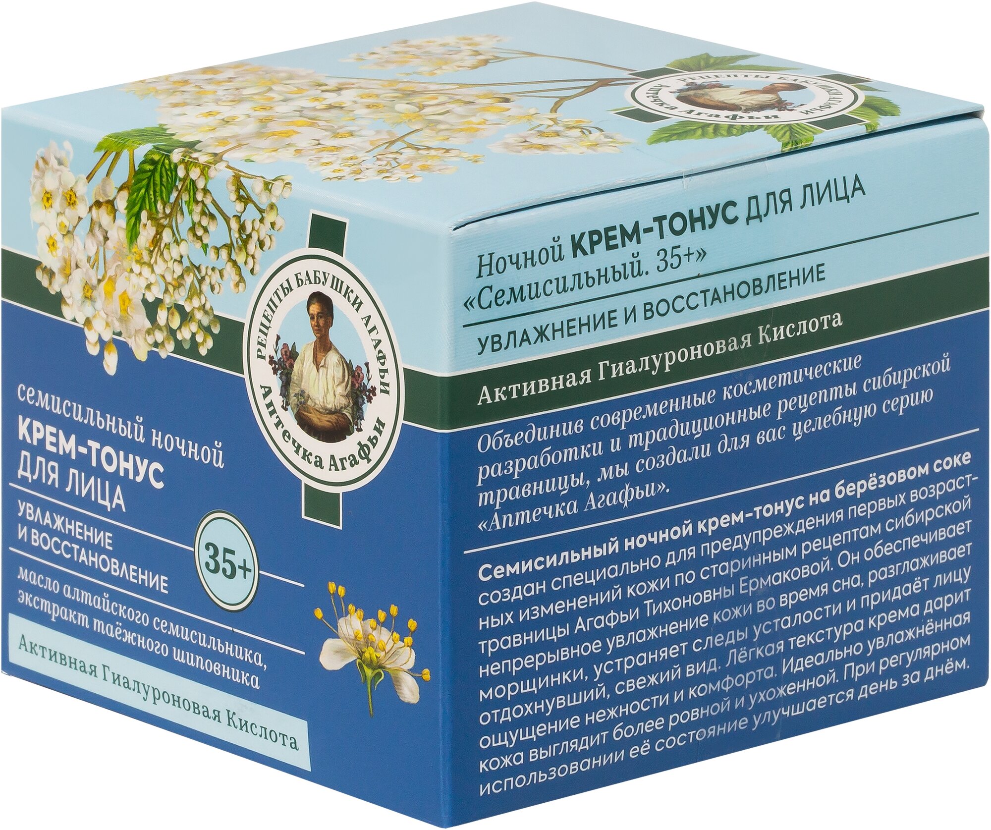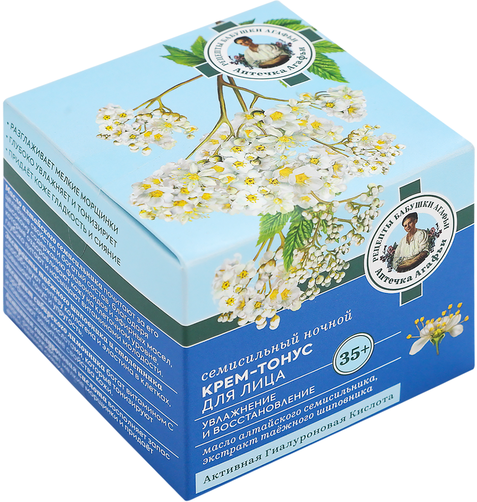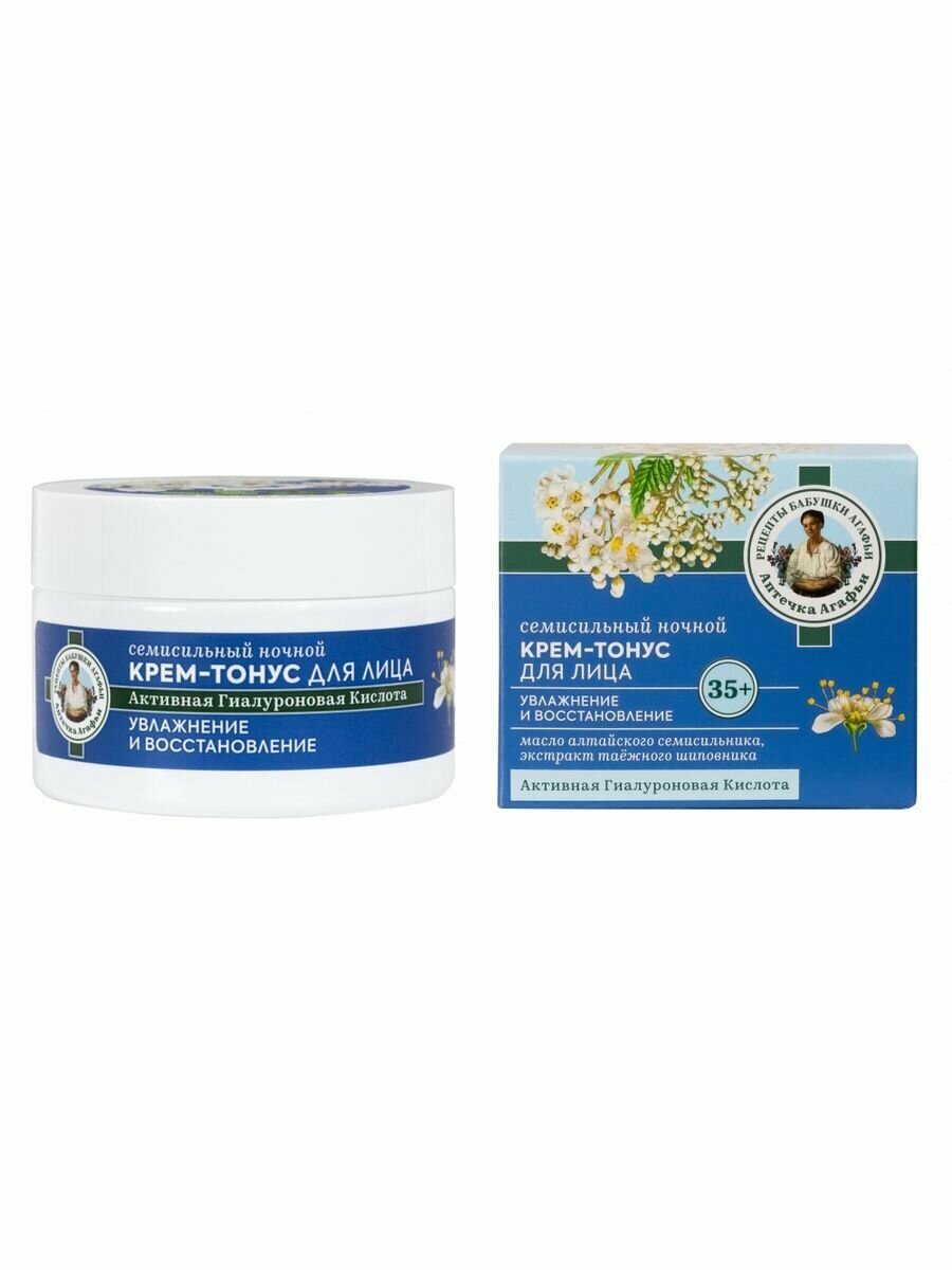 Семисильный ночной крем-тонус на берёзовом соке создан специально для предупреждения первых возрастных изменений кожи по старинным рецептам сибирской травницы Агафьи Тихоновны Ермаковой. Он обеспечивает непрерывное увлажнение кожи во время сна, разглаживает морщинки, устраняет следы усталости и придаёт лицу отдохнувший, свежий вид. Лёгкая текстура крема дарит ощущение нежности и комфорта. Идеально увлажнённая кожа выглядит более ровной и ухоженной. При регулярном использовании её состояние улучшается день за днём.