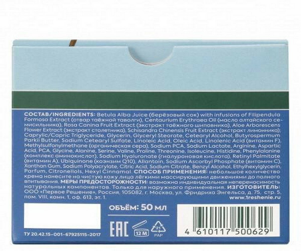 | Состав | betula alba juice (берёзовый сок) with infusions of filipendula formosa extract (отвар таёжной таволги); centaurium erythraea extract (экстракт алтайского семисильника); rosa canina fruit extract (экстракт таёжного шиповника); aloe arborescens flower extract (экстракт столетника); schisandra chinensis fruit extract (экстракт лимонника); caprylic/capric triglyceride; glycerin; glyceryl stearate; cetearyl alcohol; butyrospermum parkii butter; sodium cetearyl sulfate; linoleic acid; oleic acid; linolenic acid (витамин f); methylsulfonylmethane (органическая сера); sodium pca; sodium lactate; arginine; aspartic acid; pca; glycine; alanine; serine; valine; proline; threonine; isoleucine; histidine; phenylalanine (комплекс аминокислот); sodium hyaluronate (гиалуроновая кислота); retinyl palmitate (витамин а); ubiquinone (коэнзим q10); allantoin; sodium ascorbyl phosphate (витамин с); xanthan gum; sodium polyacrylate; citric acid; sodium citrate; benzyl alcohol; ethylhexylglycerin; parfum; citronellols; hexyl cinnamal |