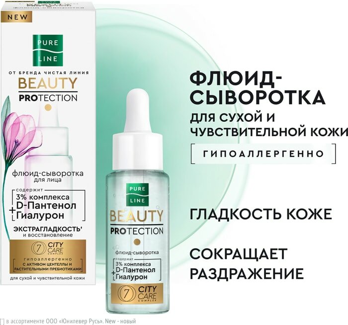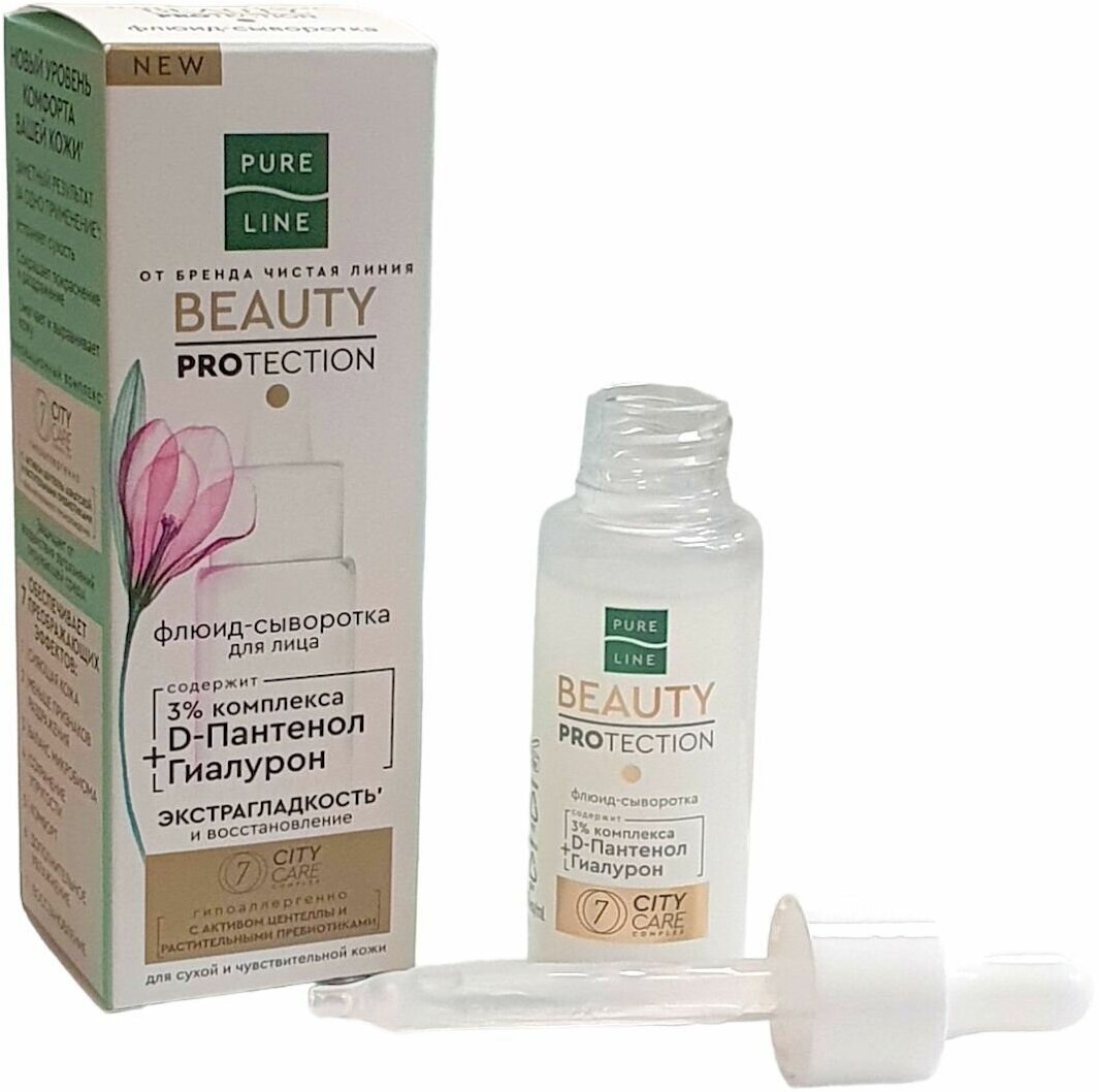 Активировать естественные механизмы защиты кожи? Легко! С новым уровнем комфорта вашей кожи Pure Line от бренда Чистая Линия! Гипоаллергенная флюид-сыворотка разработана специально для сухой и чувствительной кожи. Содержит 3% комплекса с D-пантенолом и гиалуроном, комплекс 7 CITY CARE. Результат: сухость устранена, сокращены покраснение и раздражение, кожа смягчена и выровнена.