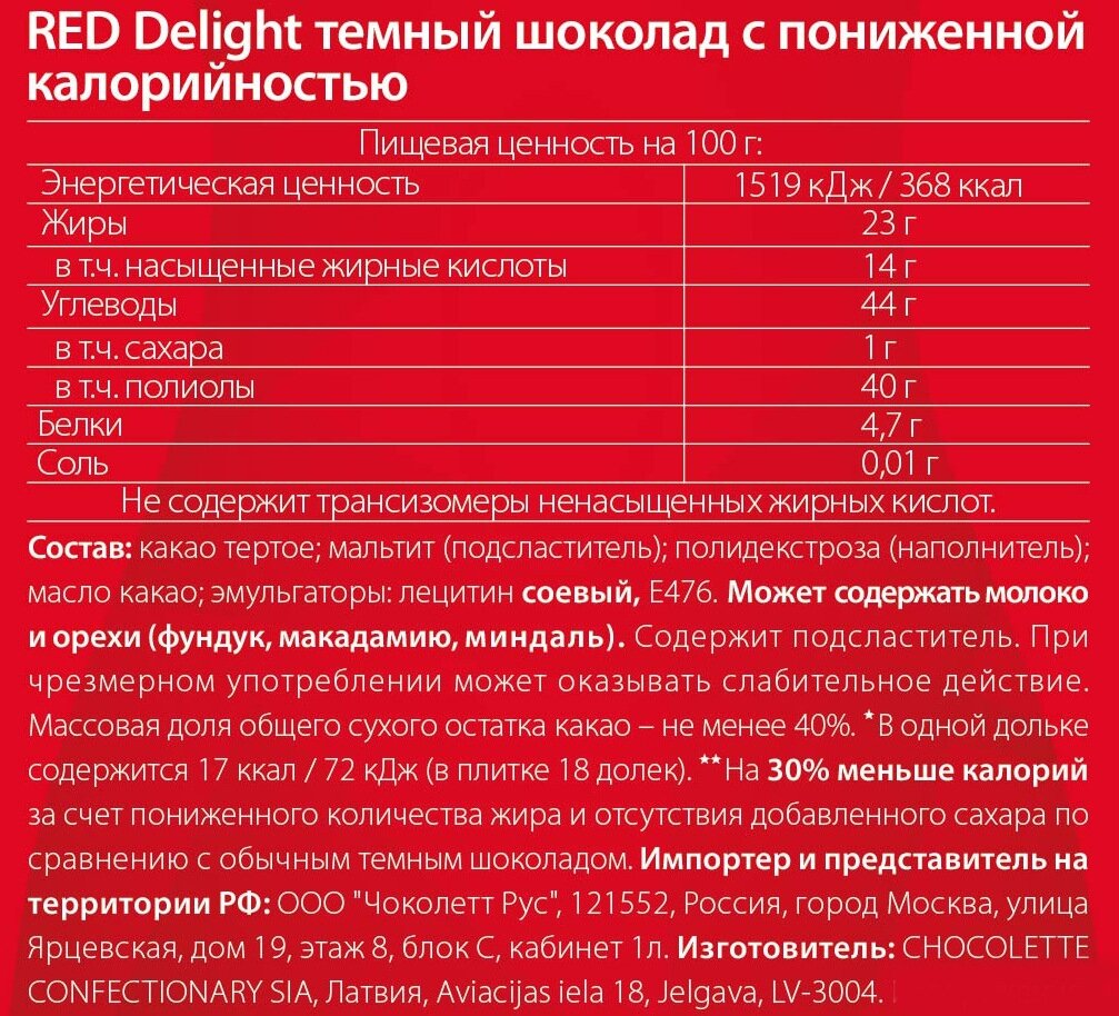 Изготовлен в Европе: шоколад RED изготавливает швейцарская компания Chocolette Confectionary на своей новой фабрике в Латвии. Качество шоколада гарантировано сертификатом BRC, признанным в 30 странах мира.