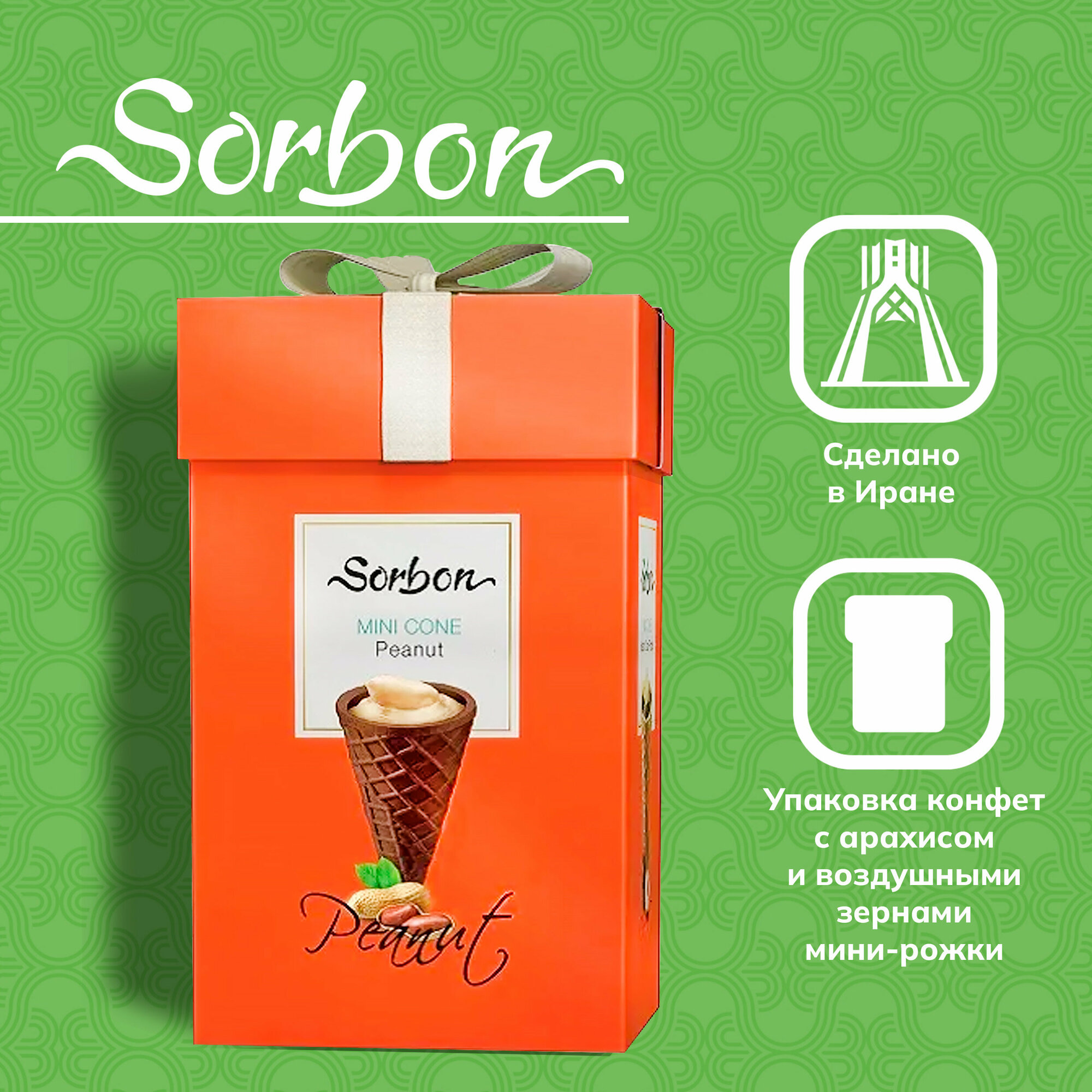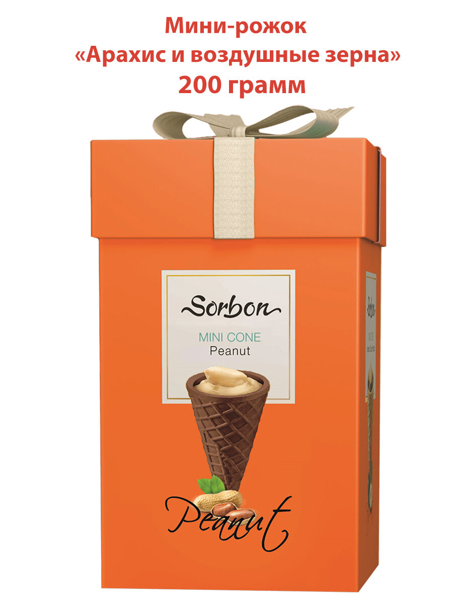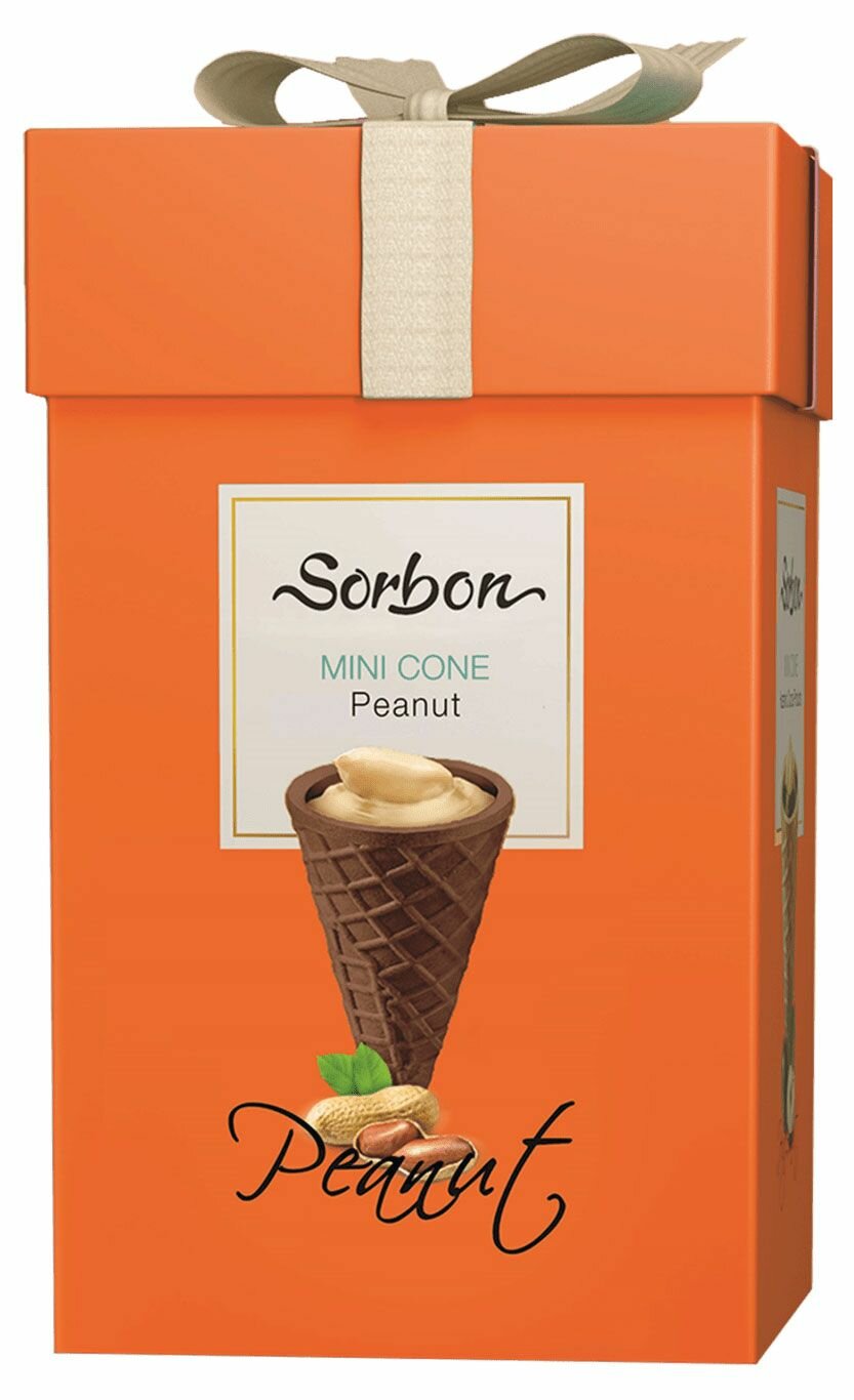 Мини-рожки Sorbon конфеты (sorbon mini cone) - это хрустящий вафельный рожок и нежная, невероятно вкусная начинка "Арахис и воздушные зерна" в подарочной упаковке.