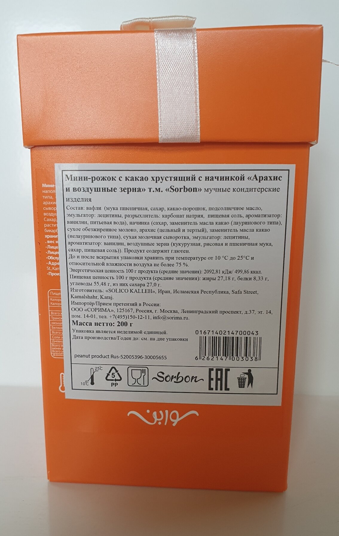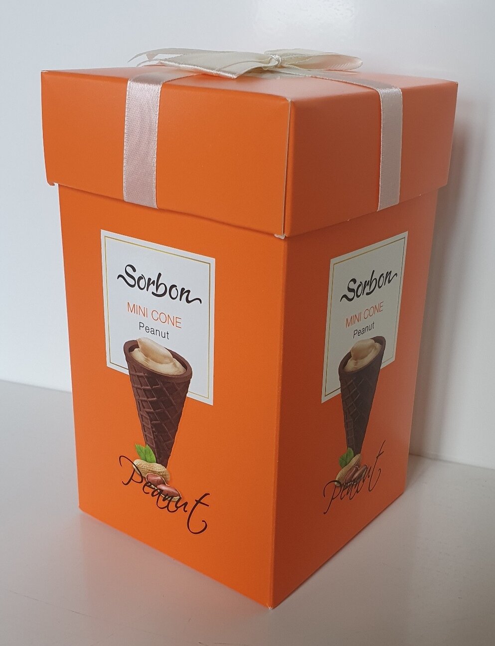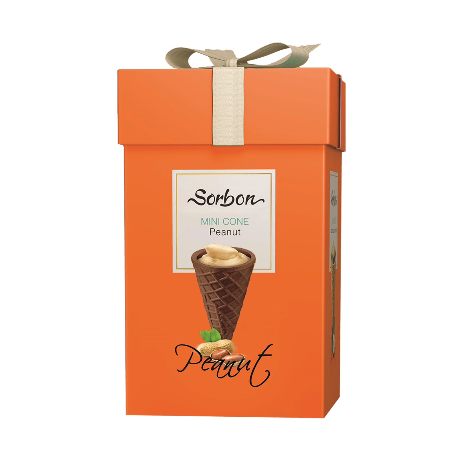 Мини-рожки Sorbon конфеты (sorbon mini cone) - это хрустящий вафельный рожок и нежная, невероятно вкусная начинка "Арахис и воздушные зерна" в подарочной упаковке.