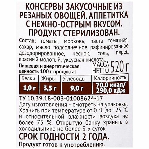 | Состав | томаты, морковь, томатная паста, сахар, масло подсолнечное рафинированное дезодорированное, чеснок, соль, перец красный молотый, уксусная кислота |
