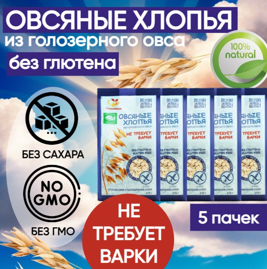 | Состав | Овсяные хлопья из голозёрного овса содержат в 1,5 раза больше овсяного масла и натурального витамина Е, богаты витаминами В1, В2, В6, каротином, витамином К. Высокое содержание бета-глюканов, снижает уровень холестерина в крови. |