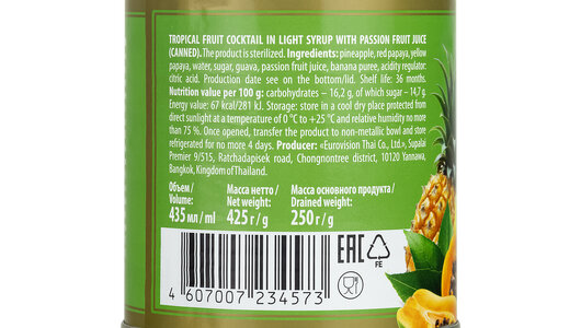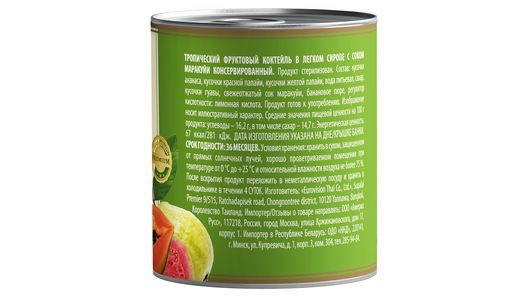 | Состав | Кусочки ананаса, кусочки красной папайи, кусочки желтой папайи, вода питьевая, сахар, кусочки гуавы, свежеотжатый сок маракуйи, банановое пюре, регулятор кислотности. |