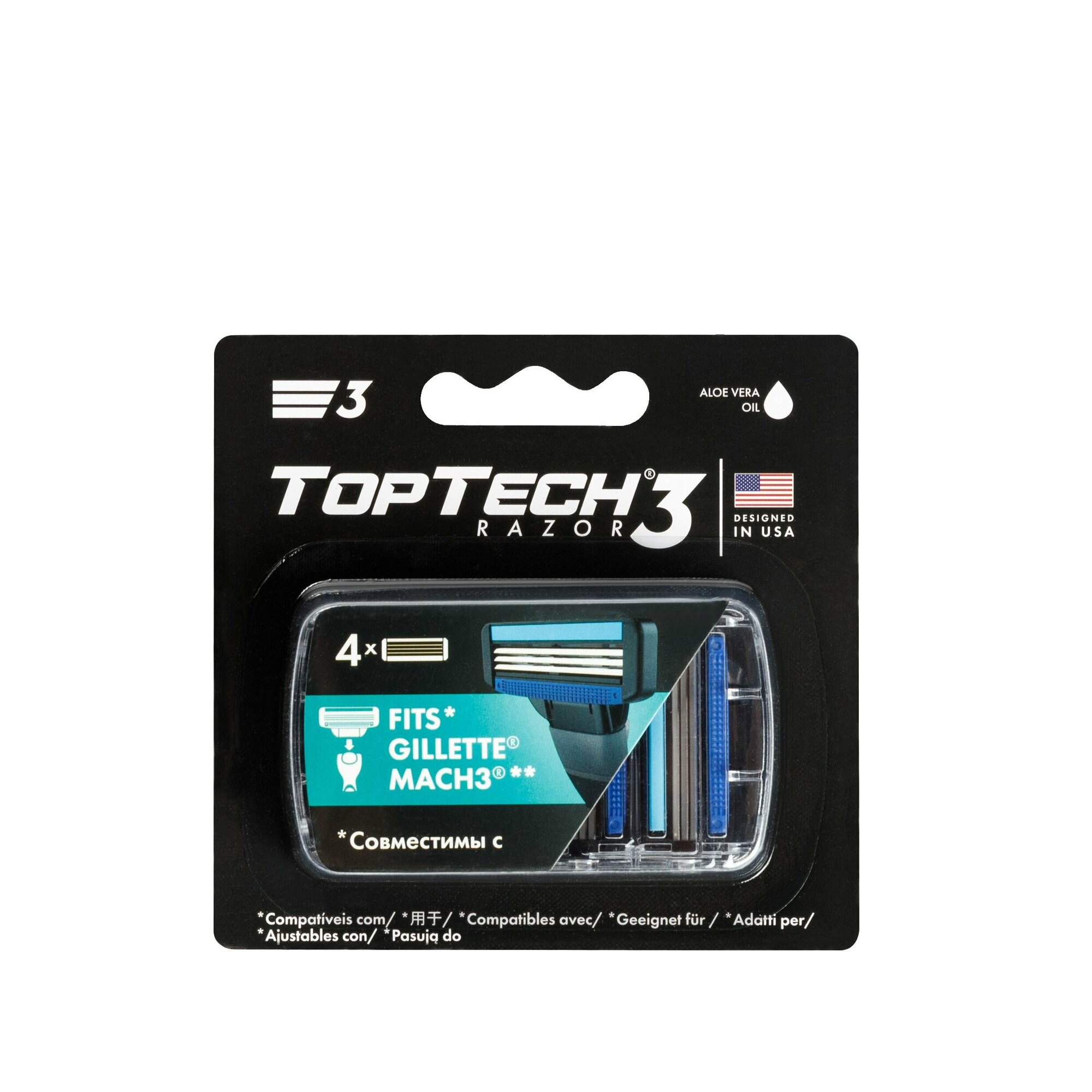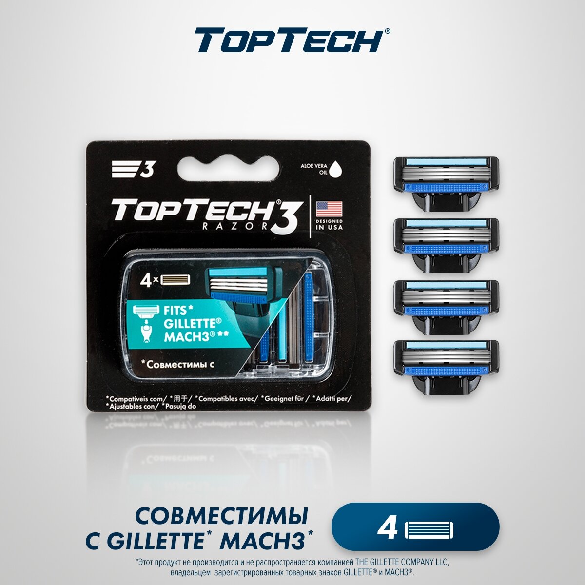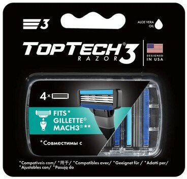 3 лезвия, производитель: "TopTech Global", США. Сменные кассеты совместимы с бритвами Gillette Mach3* и TopTech Razor 3 благодаря уникальной технологии креплений. В упаковке 4 сменные кассеты, 1 сменной кассеты хватает более чем на месяц бритья. Твердость стали сохранит лезвия острыми, для идеального скольжения без раздражений. Плавающая головка и правильный угол наклона лезвий, для комфортного бритья и для защиты кожи от порезов. Смазывающая полоска с натуральными компонентами, для дополнительного смягчения кожи. Открытая архитектура кассеты, для легкого промывания лезвий.*Этот продукт не производится и не распространяется компанией THE GILLETTE COMPANY LLC, владельцем зарегистрированных товарных знаков GILLETTE и MACH3
