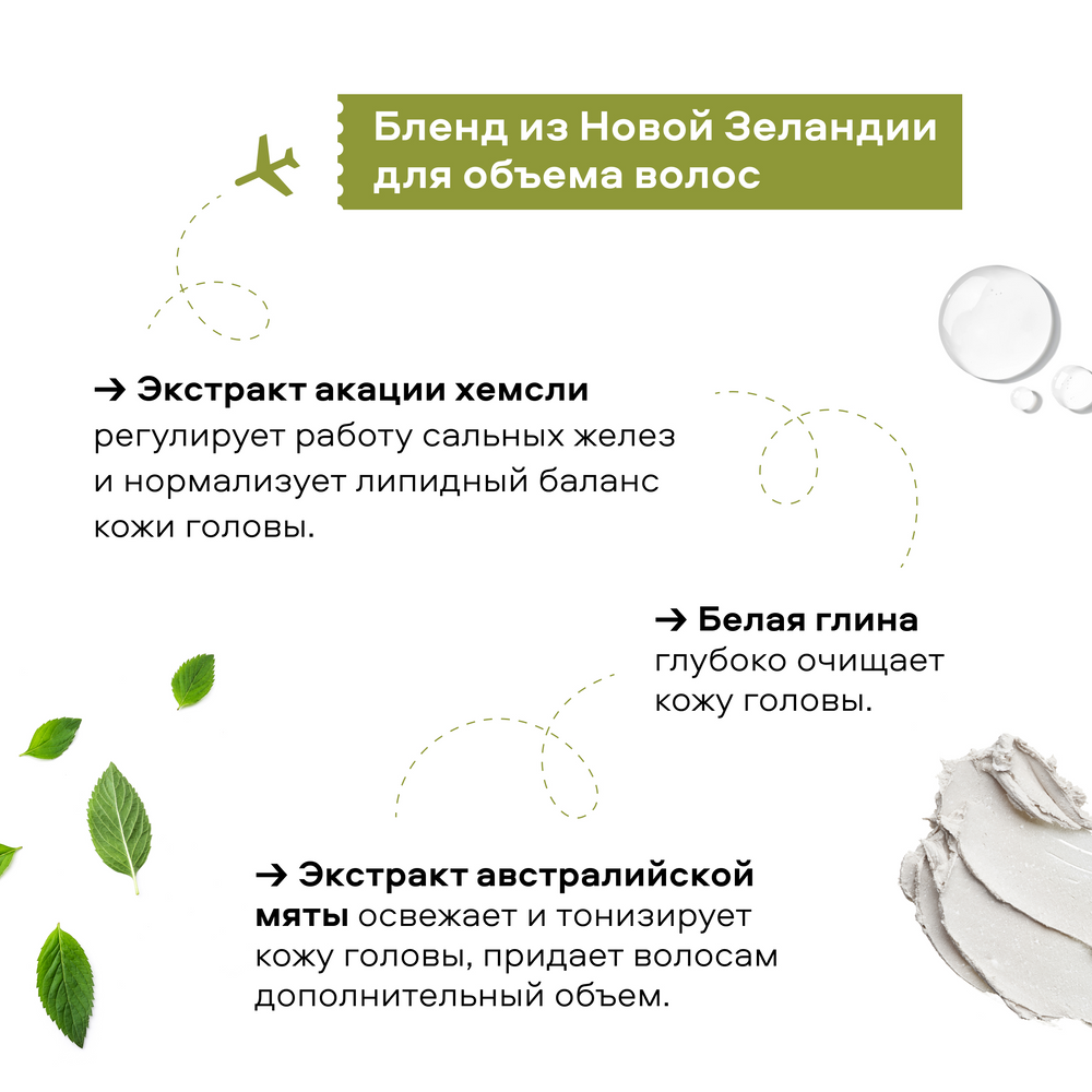 | Состав | aqua with infusions of organic robinia pseudoacacia flower extract (органический экстракт цветов акации хемсли), organic mentha longifolia extract (органический экстракт мяты австралийской), kaolin (белая глина), arginine (аргинин), sodium coco-sulfate, cocamidopropyl betaine, lauryl glucoside, sodium chloride, glycol distearate, guar hydroxypropyltrimonium chloride, citric acid, benzyl alcohol, benzoic acid, sorbic acid, ci 19140, ci 42090, parfum |
