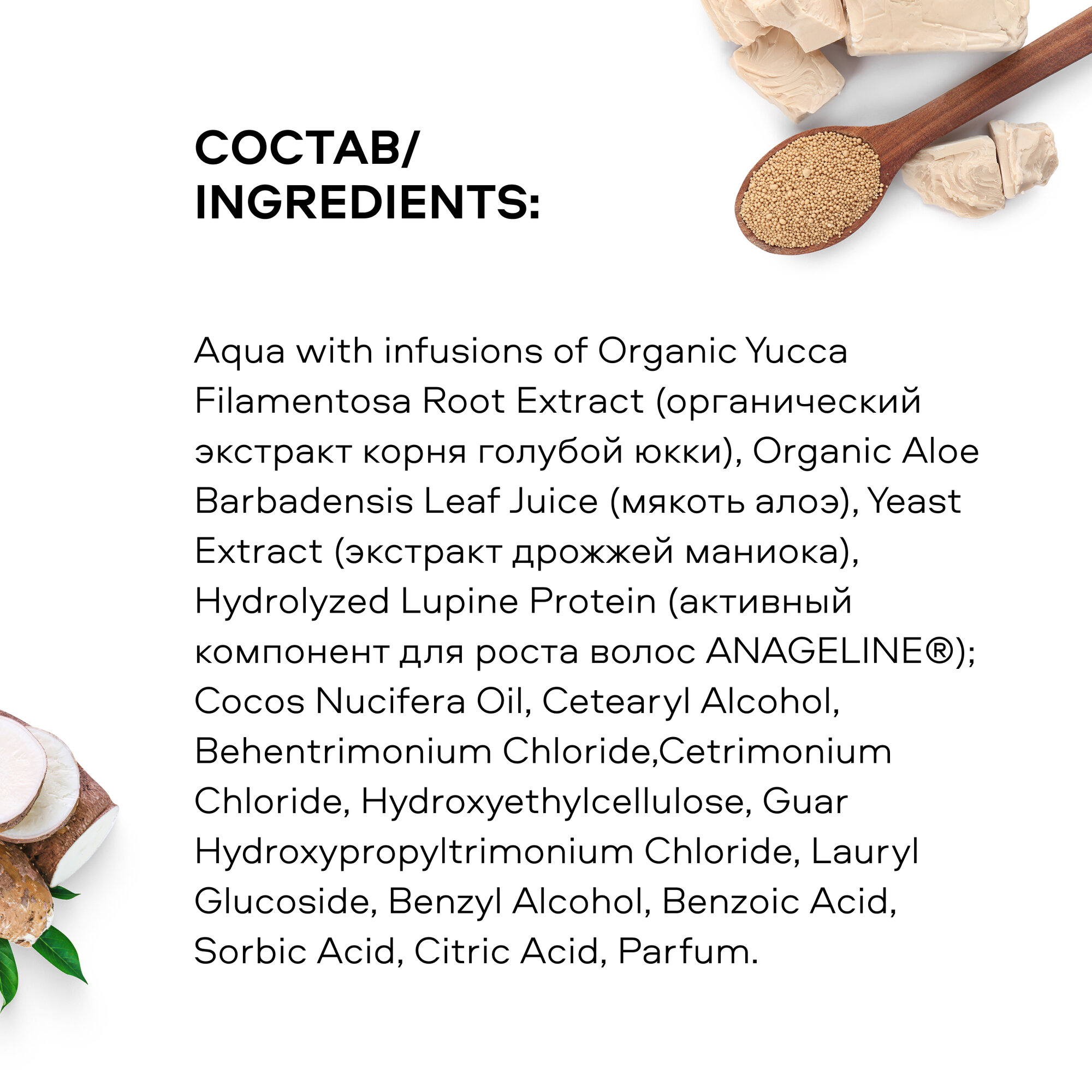 | Состав | Aqua with infusions of Organic Yucca Filamentosa Root Extract (органический экстракт корня голубой юкки), Organic Aloe Barbadensis Leaf Juice (мякоть алоэ), Yeast Extract (экстракт дрожжей маниока), Hydrolyzed Lupine Protein (активный компонент для роста волос ANAGELINE®), Cocos Nucifera Oil, Cetearyl Alcohol, Behentrimonium Chloride,Cetrimonium Chloride, Hydroxyethylcellulose, Guar Hydroxypropyltrimonium Chloride, Lauryl Glucoside, Benzyl Alcohol, Benzoic Acid, Sorbic Acid, Citric Acid, Parfum |
