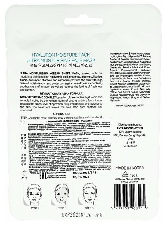 Ультраувлажняющая корейская тканевая маска, пропитанная уникальной детокс-сывороткой, обогащенной гиалуроновой кислотой, экстрактом зеленого чая, алоэ, солодки, орхидеи, огурца, ромашки и аллантоином, действует как мгновенная увлажняющая инъекция. Усовершенствованная формула защищает кожу от высыхания, эффективно ликвидирует симптомы раздражения и придает коже ощущение свежести и комфорта. Nog-saeg dermo complex на основе ультраэффективной гиалуроновой формулы, вдохновленной корейскими ритуалами красоты, интенсивно увлажняет, придавая коже шелковистую гладкость и блеск. Процедура оставляет кожу бархатисто мягкой, успокаивая и питая ее.