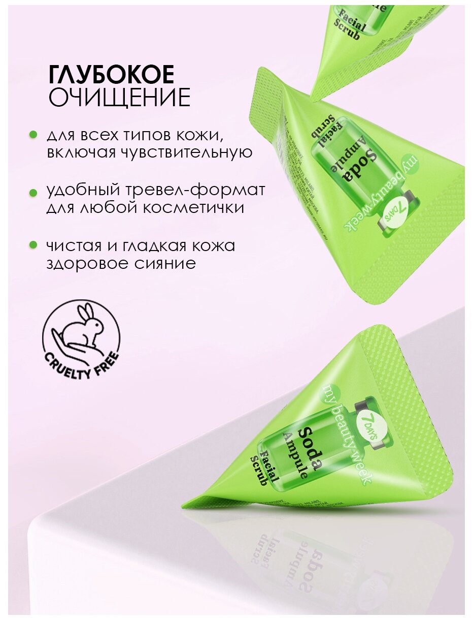 Скраб для лица 7DAYS SODA c Центеллой Азиатской и Содой для глубокого очищения и обновления кожи. Удобный мини-формат идеально подходит для путешествий. SMART уход MY BEAUTY WEEK это сочетание умных ингредиентов и инновационных формул для 100% эффективности. Содовый скраб матирует, очищает поры, устраняет черные точки, выравнивает тон и текстуру кожи. Эффективная формула с рабочим % ввода компонентов: Центелла Азиатская увлажняет, борется с несовершенствами, восстанавливает и успокаивает кожу. Мельчайшие частицы Соды бережно отшелушивают ороговевшие клетки, не травмируя кожу, способствует обновлению, осветлению и улучшению цвета лица. Корейский скраб для лица для всех типов кожи, даже для чувствительной. Подходит для всесезонного использования, для всех типов кожи, не тестируется на животных. Компактная travel-упаковка позволяет взять скраб с собой в путешествие, его хватает на 2-3 применения. PERFECT MATCH: крем для лица Vitamin C MY BEAUTY WEEK. From Korea with love.
