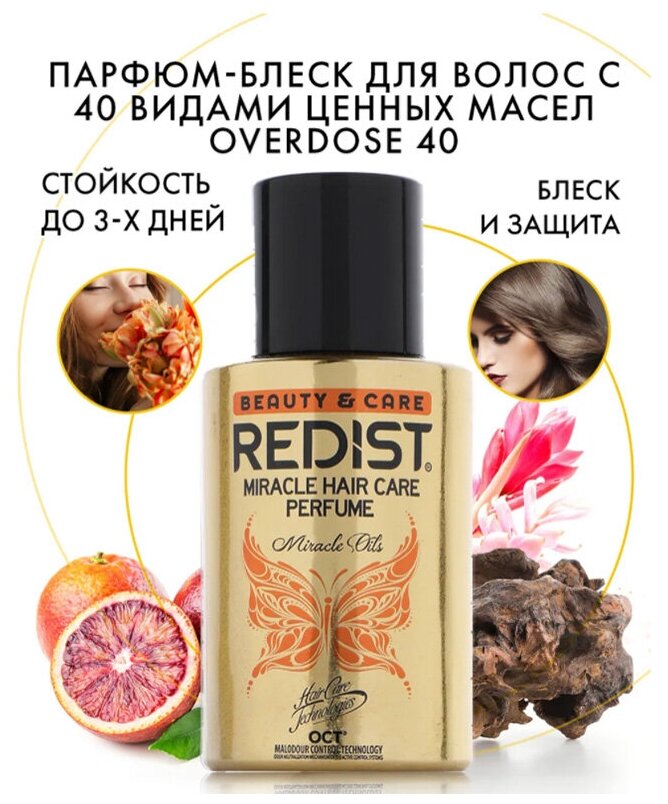 Дополните образ ароматом от Redist. Парфюм-блеск для волос это цветочно-цитрусовые нотки, создающие ароматную вуаль на ваших волосах. Парфюм-блеск устраняет неприятные запахи, в том числе запахи пищи и сигаретного дыма, увлажняет и придает видимый блеск, благодаря содержанию витаминного комплекса. Особая формула средства, в отличие от обычного парфюма, не содержит веществ, которые могут навредить волосам. 40 видов масел, входящие в состав парфюма-блеска, питают сильно поврежденные и пористые волосы.