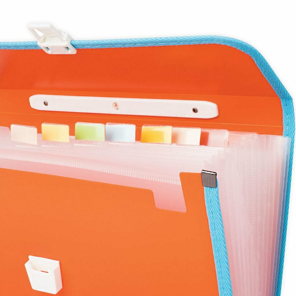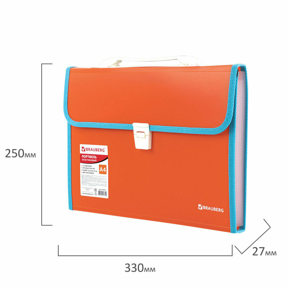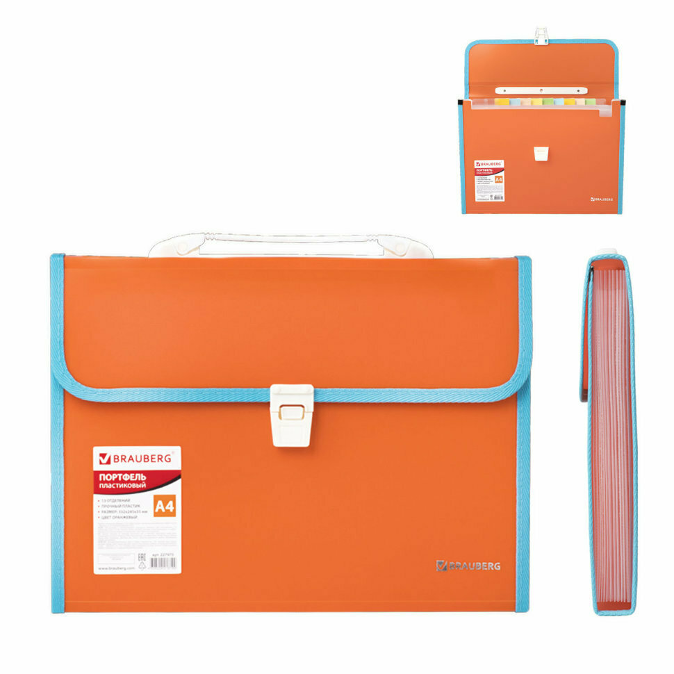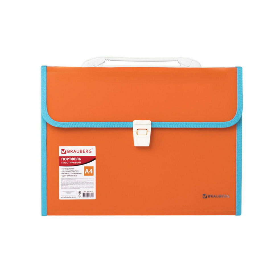 Портфель BRAUBERG JOY предназначен для транспортировки документов, бумаг и различных предметов и широко используется школьниками, студентами, офисными работниками и людьми творческих профессий. Портфель формата А4 (330х245х35 мм) изготовлен из плотного пластика стандартной фактуры толщиной 0,7 мм, выполнен в ярком бирюзовом цвете и имеет 13 отделений с индексными ярлыками. Складная ручка обеспечивает компактность изделия. Портфель застегивается на клапан. Края окантованы тканью с металлическими рейками по краям окантовки, что придает изделию презентабельный вид. Товар представлен в ассортименте, без возможности выбора.
