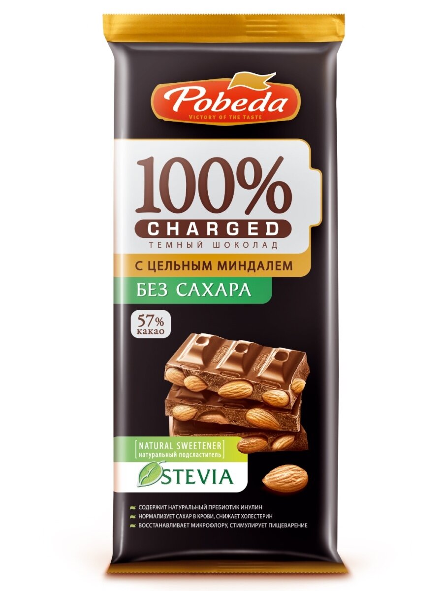 Шоколад Победа вкуса Тёмный без добавления сахара с цельным миндалем Чаржед 90 г