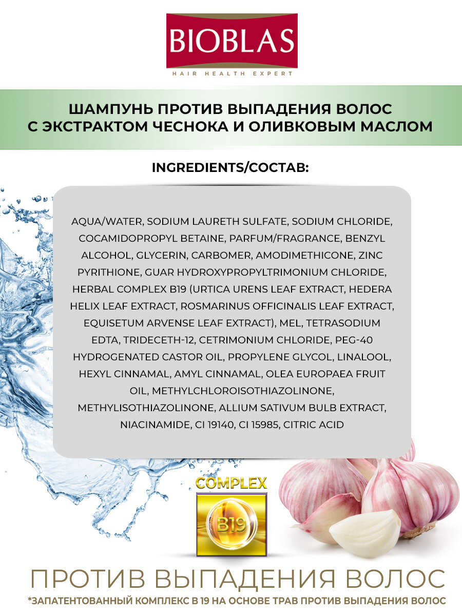 | Состав | Aqua/water, sodium laureth sulfate, sodium chloride, cocamidopropyl betaine, parfum/fragrance, benzyl alcohol, glycerin, carbomer, amodimethicone, zinc pyrithione, guar hydroxypropyltrimonium chloride, herbal complex b19 (urtica urens leaf extract, hedera helix leaf extract, rosmarinus officinalis leaf extract, equisetum arvense leaf extract), mel, tetrasodium edta, trideceth-12, cetrimonium chloride, peg-40 hydrogenated castor oil, propylene glycol, linalool, hexyl cinnamal, amyl cinnamal, olea europaea fruit oil, methylchloroisothiazolinone, methylisothiazolinone, allium sativum bulb extract, niacinamide, CI 19140, CI 15985, citric acid |