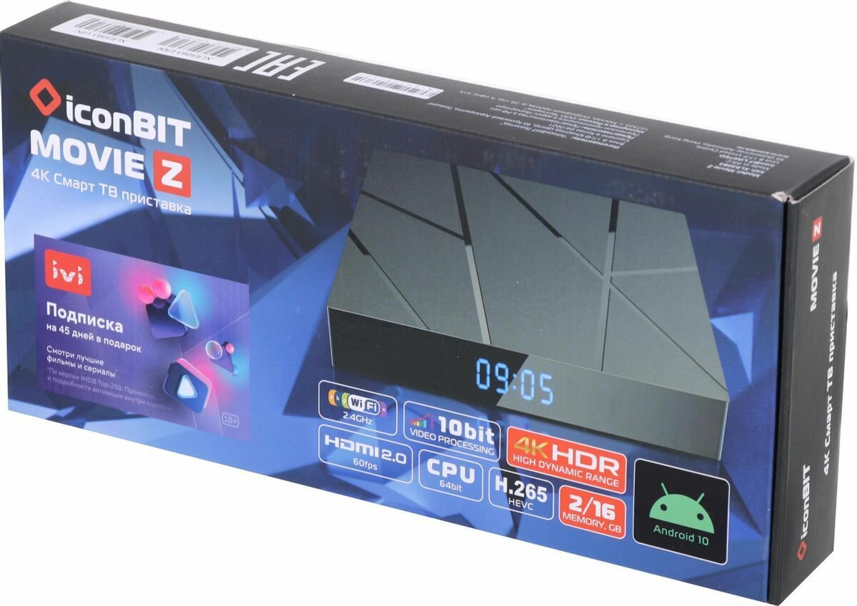Smart TV приставка на базе Android 10. Воспроизведение видео в формате высокой четкости 4K HDR 10 Bit. Оборудован 4-ядерным процессором, памятью 2 ГБ ОЗУ / 16 ГБ Flash, 2-мя портами USB 2.0 для подключения внешних дисков, клавиатуры, мыши. Имеет видеовыход HDMI и аудиовыход AV, экран на лицевой панели, возможность подключения внешней памяти через слот microSD. Подключение к интернету происходит по протоколам 2,4G Wi-Fi 802.11 b/g/n или 100 Mb LAN (RJ-45). Пульт управления стандартный с эмуляцией управления мышью. В комплекте кабель HDMI 2.0. В медиаплеер предустановлены все необходимые программы, а также установка любых приложений из Play Market или apk. Установлены онлайн кинотеатр IVI, онлайн телевидение 24ТВ с подпиской.