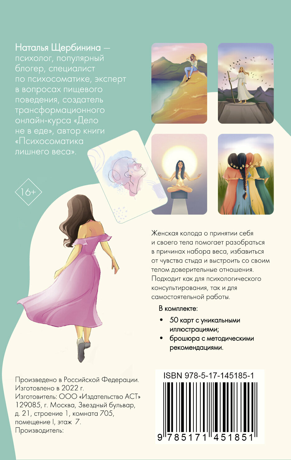 Наталья Щербинина - психолог, специалист по психосоматике, эксперт в вопросах пищевого поведения, популярный блогер и создатель трансформационного онлайн-курса Дело не в еде, автор книги Психосоматика лишнего веса. И просто женщина, которая смогла избавиться от лишнего веса, опираясь на последние научные достижения в области физиологии и психологии, и нашла свой рецепт идеального тела. Метафорические ассоциативные карты Психосоматика. Принятие своего тела - авторская женская колода для работы с первопричинами лишнего веса и проблемами пищевого поведения. В каждой из 50 карт зашифрован определенный смысл, послание автора, дешифрующее и интерпретирующее переживания и страхи, чувства и эмоциональные состояния реальных женщин, столкнувшихся с проблемой разрыва связи с собственным телом. Колода Натальи Щербининой подходит как для психологического консультирования, так и для самостоятельной работы.