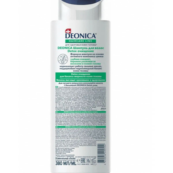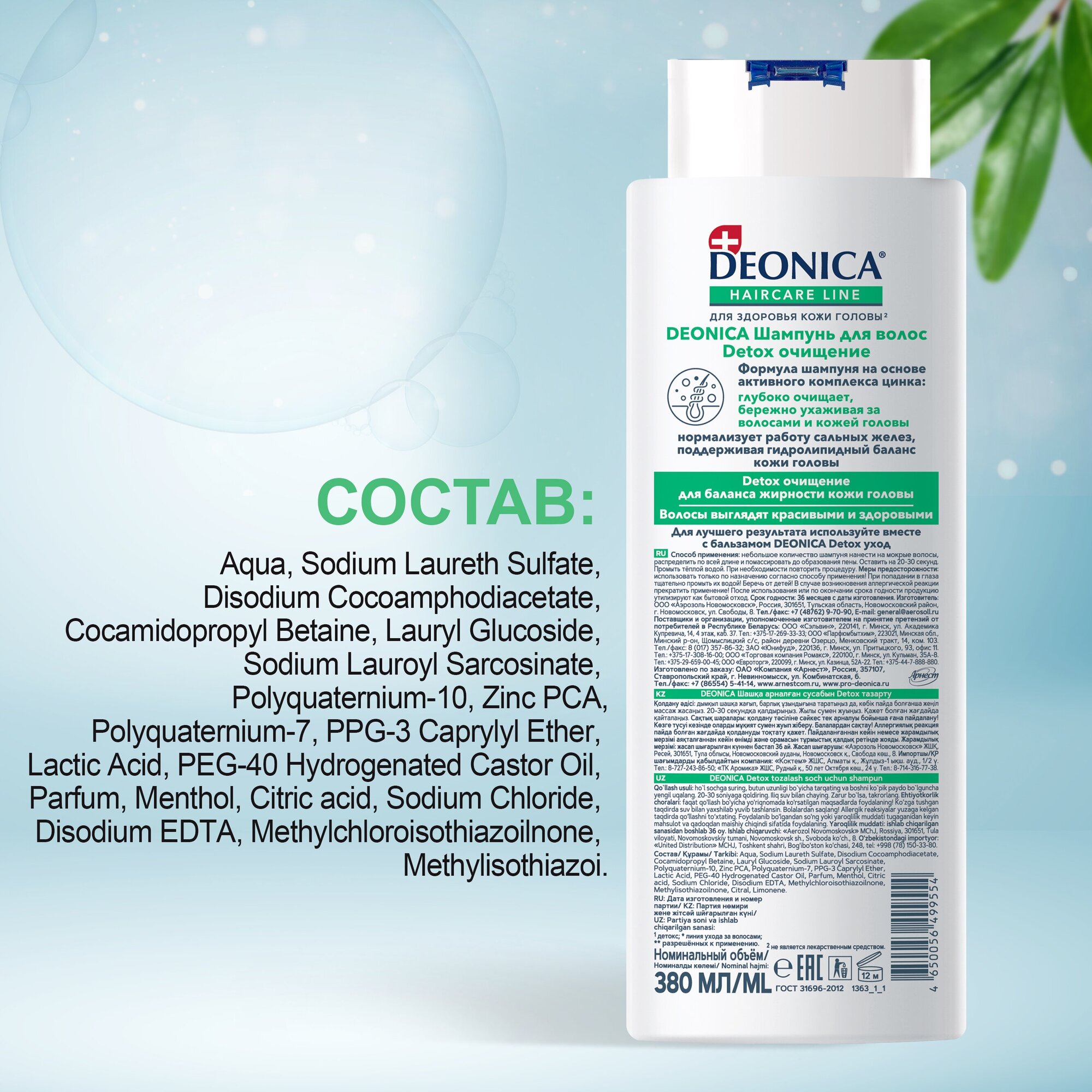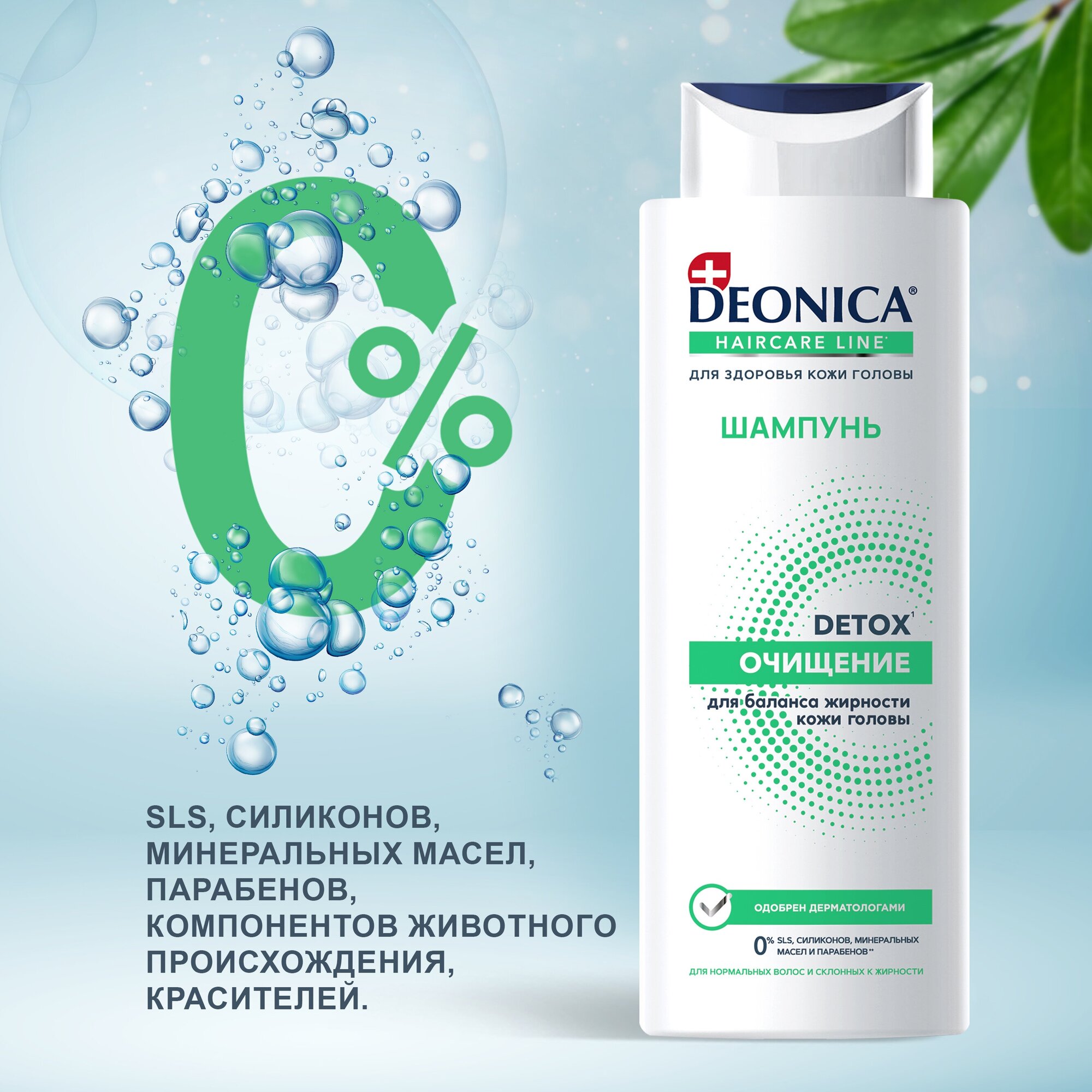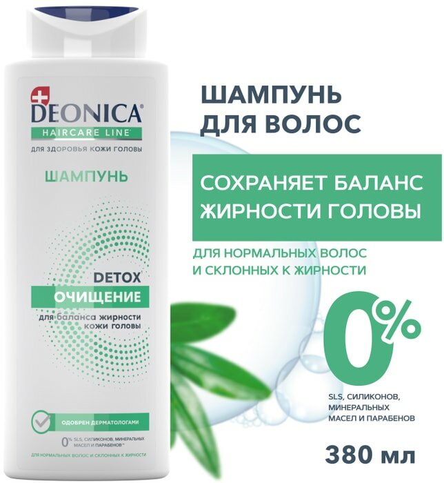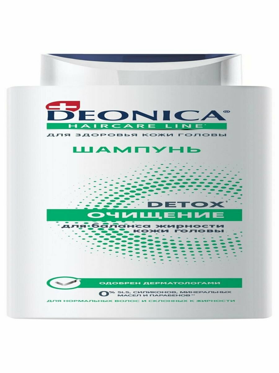 Шампунь Detox-уход от Deonica предназначен для глубокого очищения кожи головы. В условиях города, стресса, частого применения стайлинговых средств. ШГО глубоко проникает в кожу головы и вытягивает загрязнения, удаляя их с пеной. В результате нормализуется жирность кожи головы и волосы требуется реже мыть.
