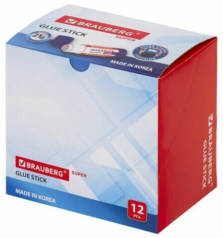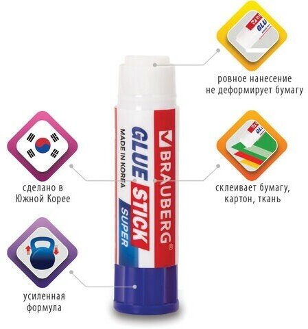 Клей-карандаш BRAUBERG SUPER обеспечивает высокий уровень склеивания бумаги, картона и фотобумаги. Идеально подходит для офиса, дома и школы. Изготовлен одним из ведущих производителей клея в Южной Корее. После нанесения высыхает без образования пятен. Не токсичен, не вызывает аллергии и безопасен для здоровья. Легко наносится и распределяется по поверхности, оставляя тонкий и ровный клеевой слой, что позволяет расходовать его экономично. Не пачкает руки, стол, одежду, не попадает на участки бумаги, расположенные возле места склеивания. Обеспечивает быстрое и надежное склеивание.