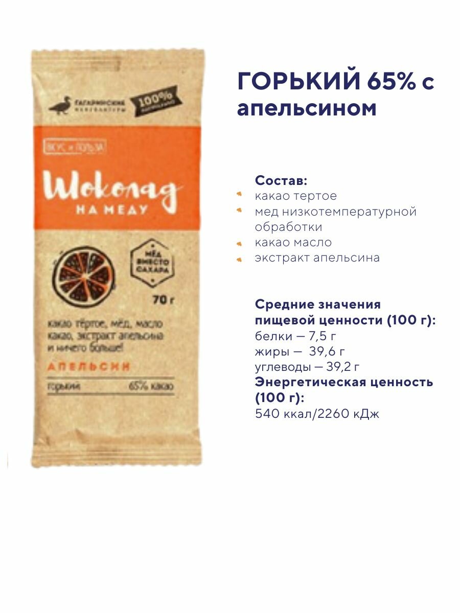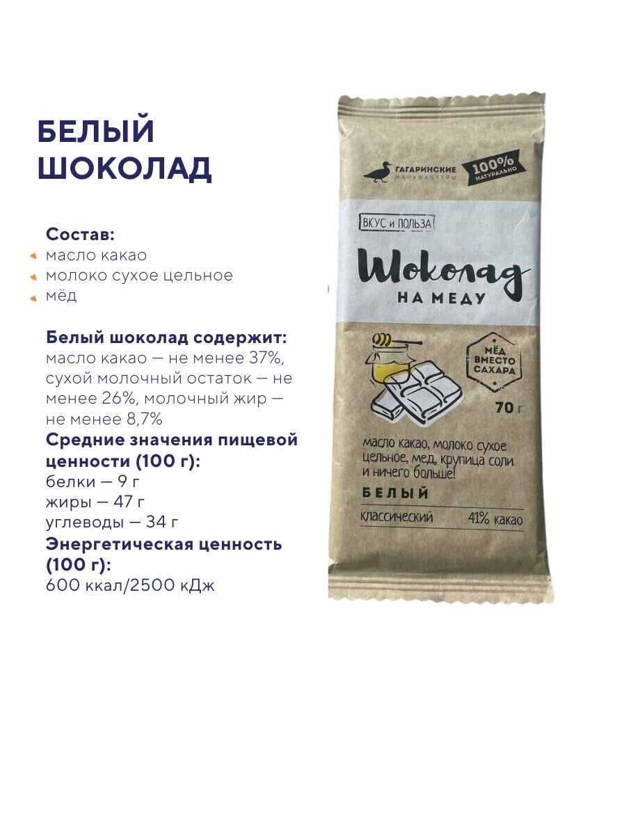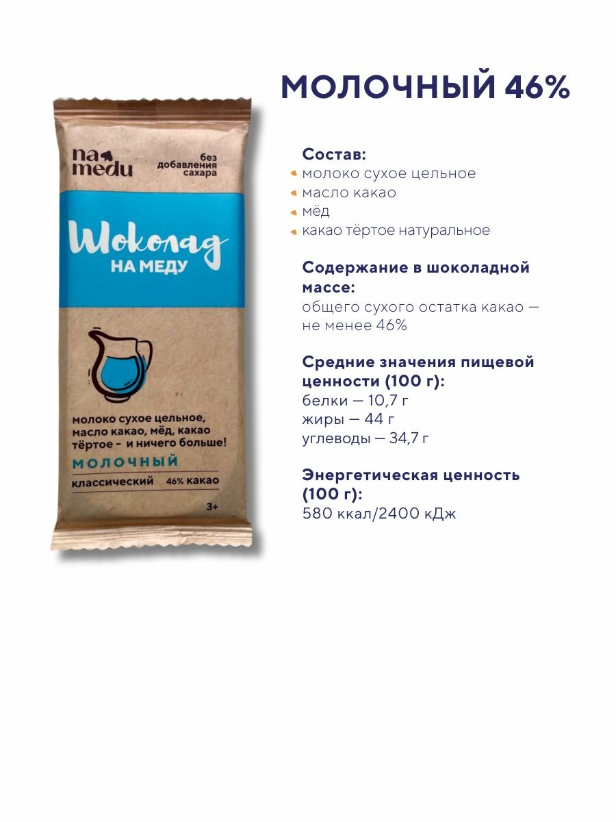 Натуральный шоколад с максимально чистым составом: какао тертое, какао масло и сырой мед. Продукт является здоровым перекусом (пп десертом). Бережная технология добавления меда уже в остывшую шоколадную массу исключает его нагревание, поэтому вы можете быть уверены, что мед не потерял своих ценных свойств во время приготовления.