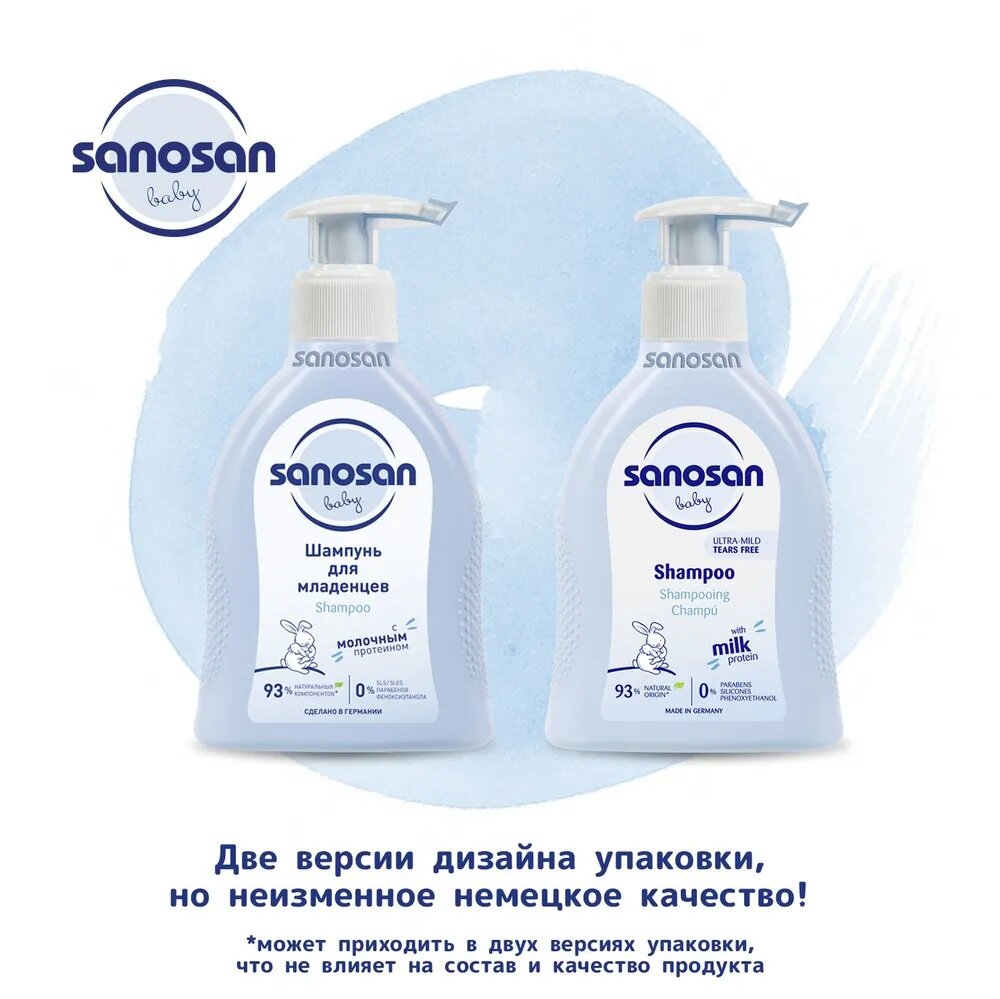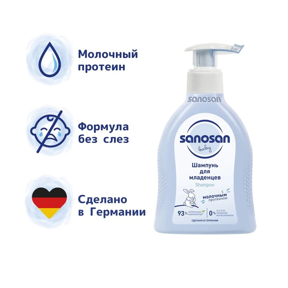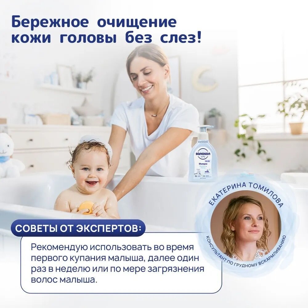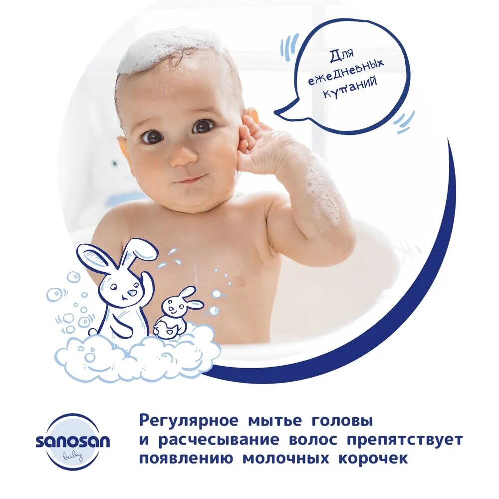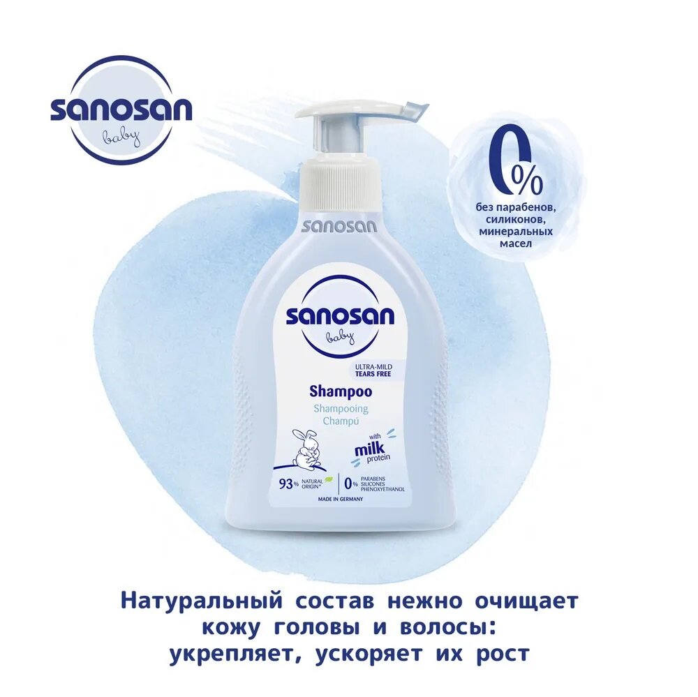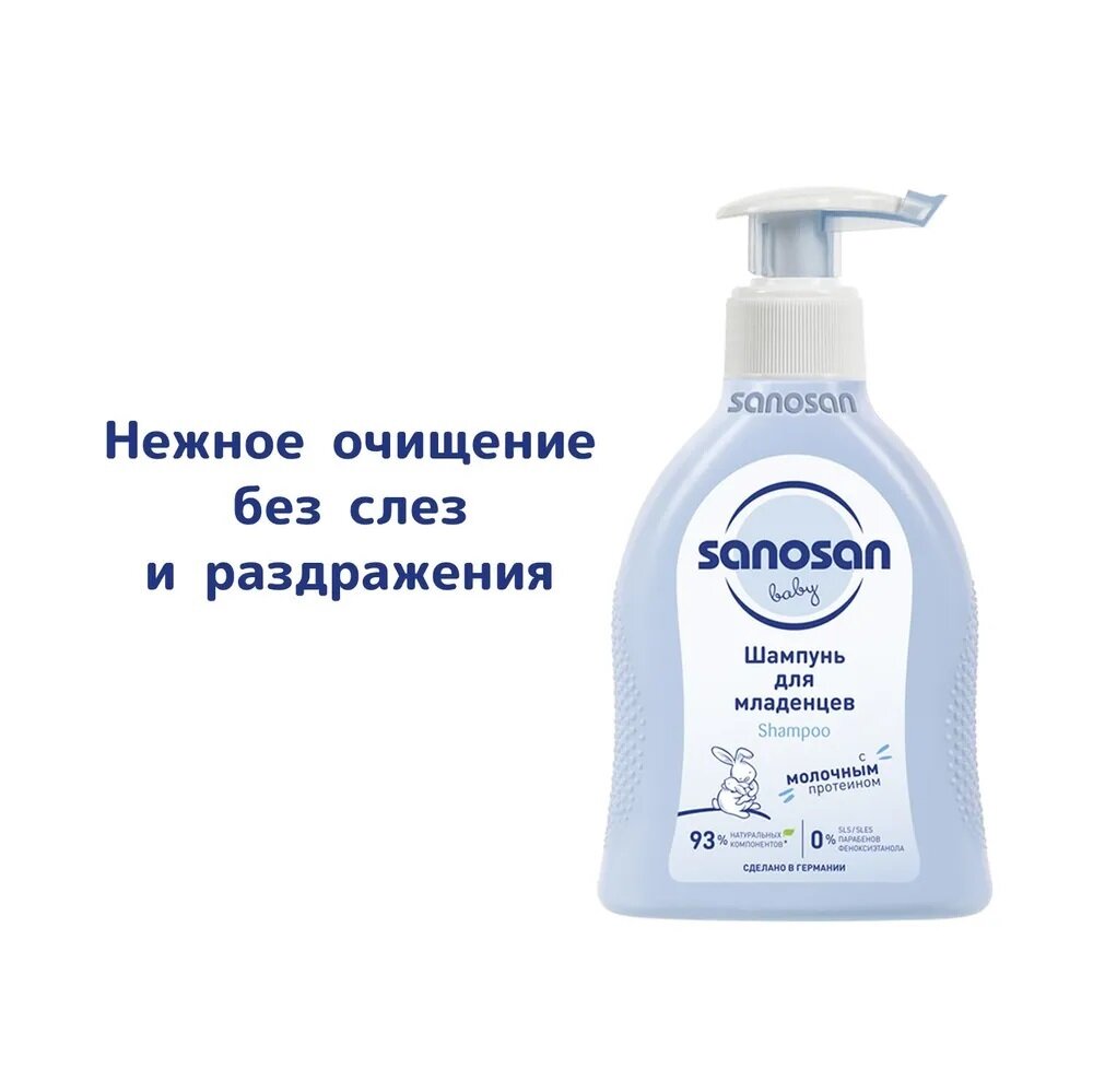 Sanosan Шампунь для младенцев содержит органический экстракт оливы и молочный протеин для бережного очищения волос малыша. Бережно очищает тонкие волосы малыша, придавая им шелковистый блеск. Способствует легкому расчесыванию. Идеально для малышей с первых дней жизни. Поддерживает естественный баланс кожи головы. Не сушит кожу. Преимущества: Безопасность: переносимость кожей подтверждена клинически. Не раздражает глаза. Не содержит парабенов, силиконов, минеральных масел, SLS/SLES и феноксиэтанола. На 93% состоит из натуральных ингредиентов. Имеет биоразлагаемый состав. Подходит для ежедневного использования.