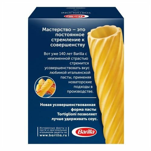 Макароны Barilla Tortiglioni 83 это высококачественная мука из твердых сортов пшеницы и вода, воплощенные в необычной форме. Полые короткие трубочки с рифлением отлично сочетаются с густыми мясными, грибными или сливочными соусами, которые обволакивают пасту, а не стекают с нее. Кроме того, паста Barilla Тортильони 83 отличный вариант для добавления в салаты и запеканки. Благодаря полностью натуральному составу, в котором нет искусственных добавок и красителей, они идеально сохраняют форму в процессе приготовления, не развариваются и не слипаются.