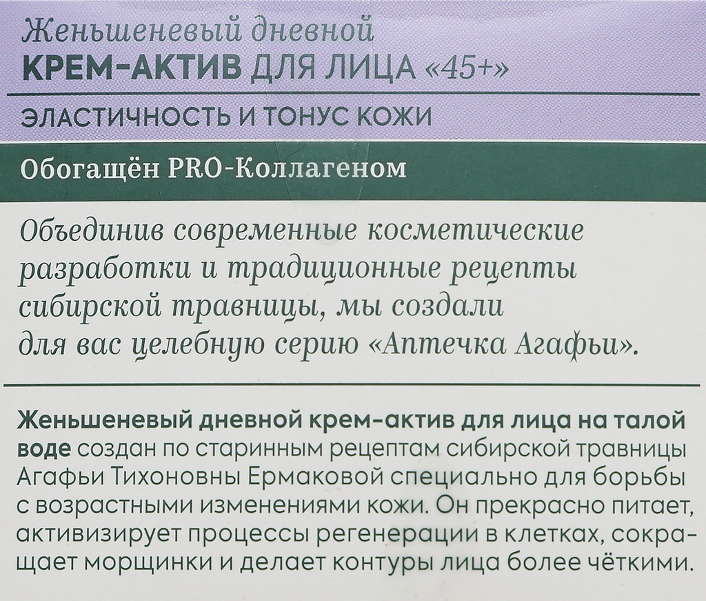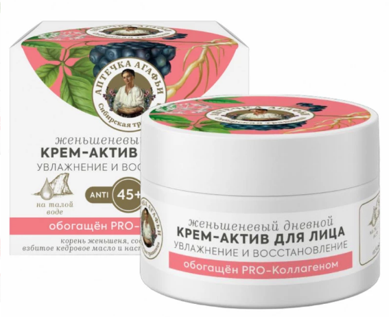 Женьшеневый дневной крем-актив для лица на талой воде создан по старинным рецептам сибирской травницы Агафьи Тихоновны Ермаковой специально для борьбы с возрастными изменениями кожи. Он прекрасно питает, активизирует процессы регенерации в клетках, сокращает морщинки и делает контуры лица более чёткими.