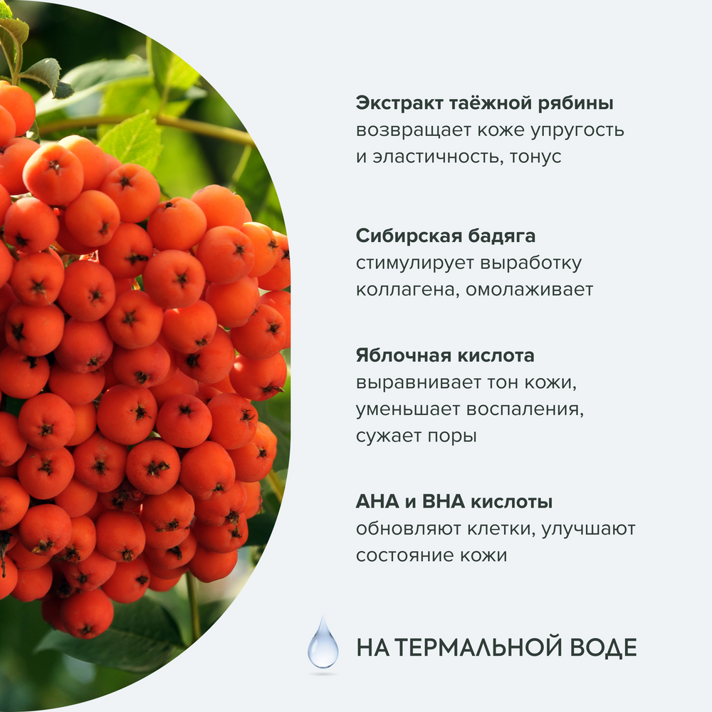 | Состав | Aqua (термальная вода) with infusions of Sorbus Aucuparia Extract (экстракт таёжной рябины), Spongilla Lacustris Spicule Extract (экстракт сибирской бадяги); Sorbus Aucuparia Seed Oil (масло семян таёжной рябины), Glycerin, Hydrogenated Starch Hydrolysate, Lactic Acid (молочная кислота), Glycolic Acid (гликолевая кислота), Malic Acid (яблочная кислота), Hydroxyethylcellulose, Panthenol (витамин В5), Salicylic Acid (салициловая кислота), Sodium Hydroxide, Heptyl Glucoside, Benzyl Alcohol, Benzoic Acid, Sorbic Acid, Parfum, CI 15985, Hexyl Cinnamal, Limonenes, Linalool. |