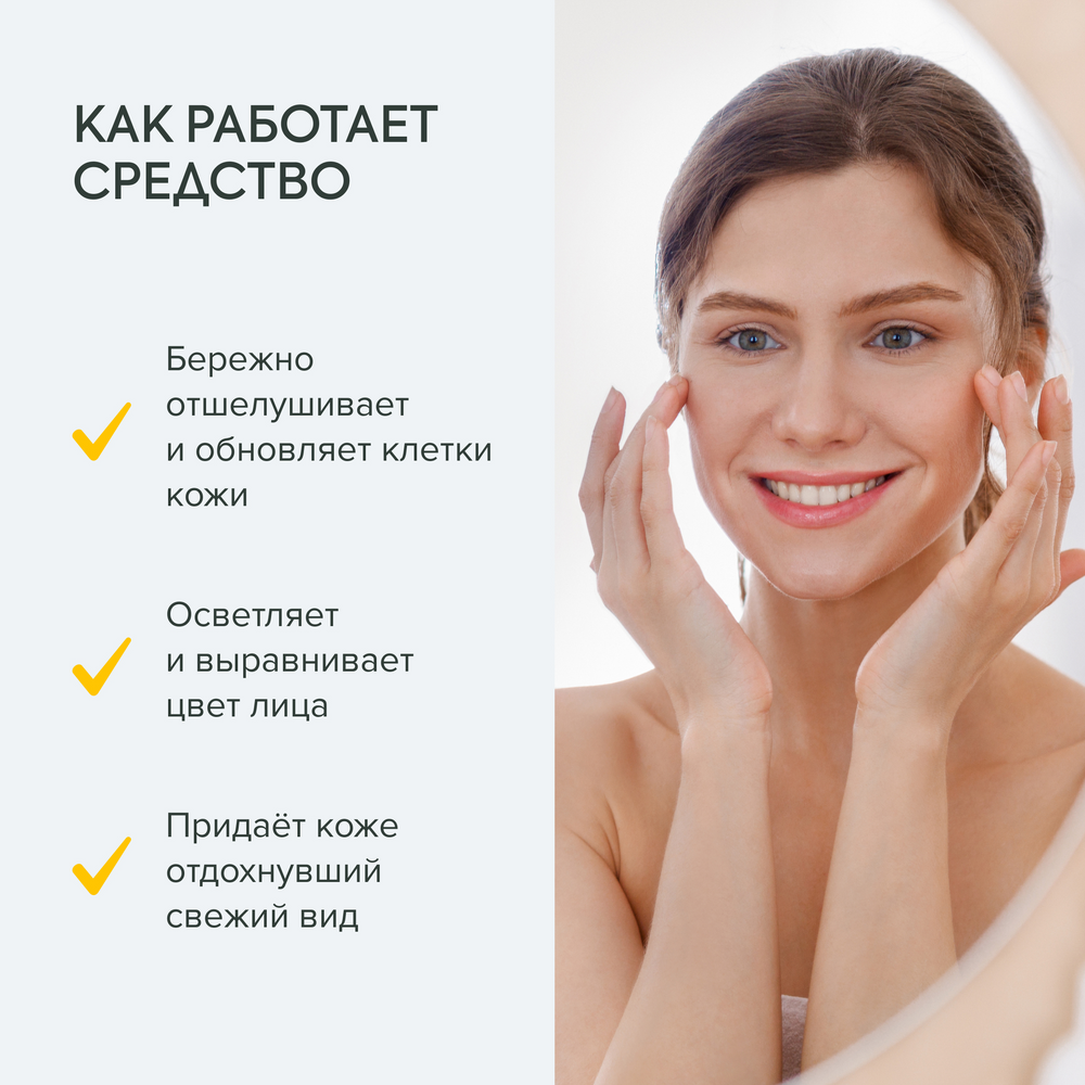 | Способ применения | Нанесите небольшое количество пилинга на влажную, чистую кожу лица лёгкими массирующими движениями, избегая области вокруг глаз и губ. Оставьте на 8-10 минут для воздействия, затем смойте тёплой водой. Используйте пилинг не чаще 1 раза в неделю |