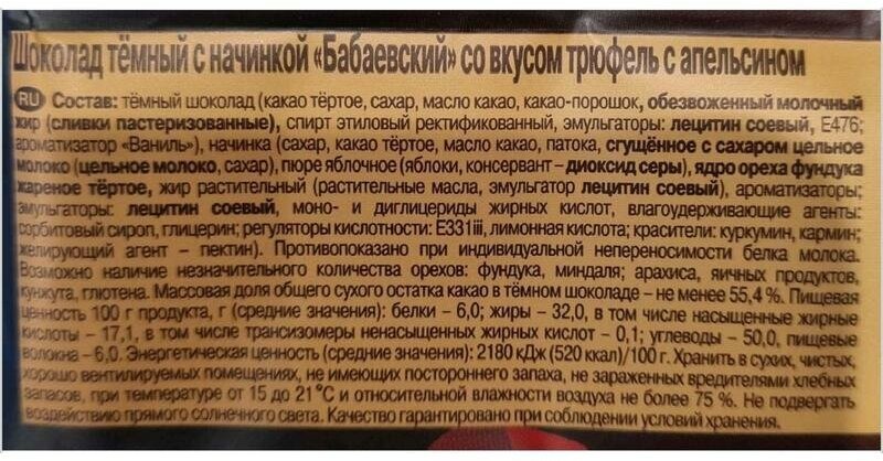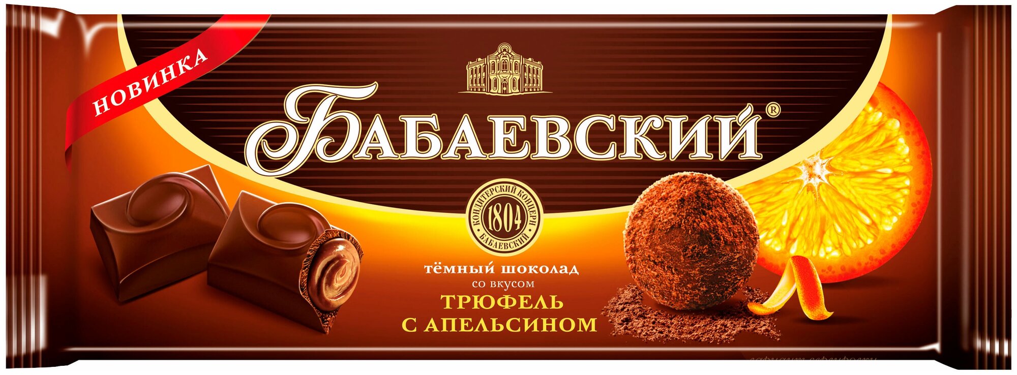Шоколад Бабаевский с нежной начинкой со вкусом трюфеля с апельсином – шоколад, в который невозможно не влюбиться. Насыщенный вкус темного шоколада и в меру сладкой начинки с ноткой апельсина – идеальный вариант, чтобы побаловать себя и близких.