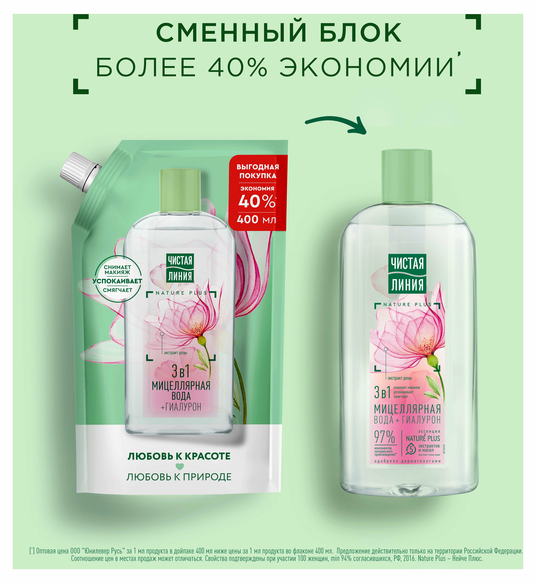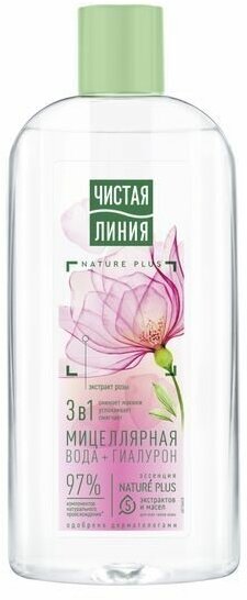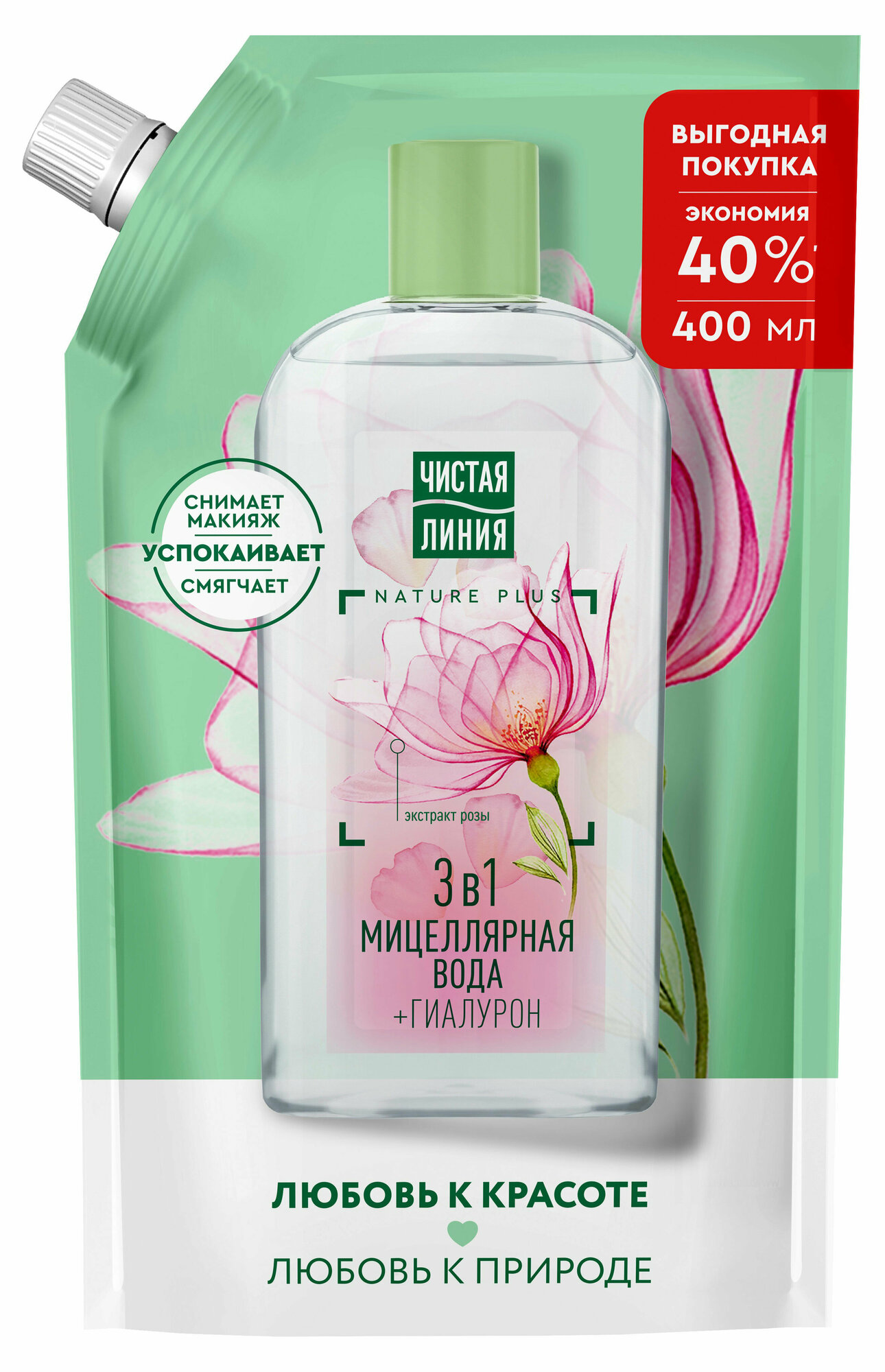 Мицеллярная вода Чистая Линия 3 в 1 с эссенцией из пяти экстрактов и масел лепестками розы и гиалуроном 400 мл