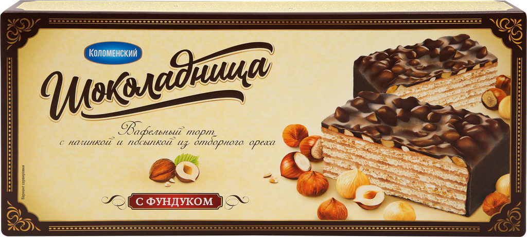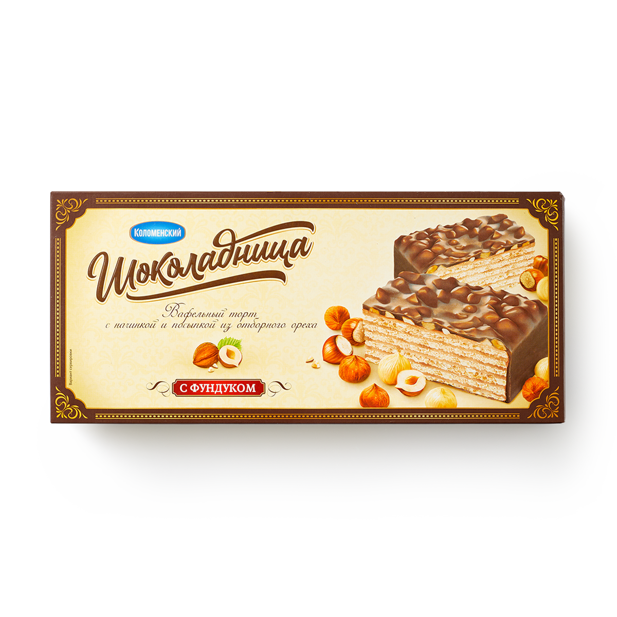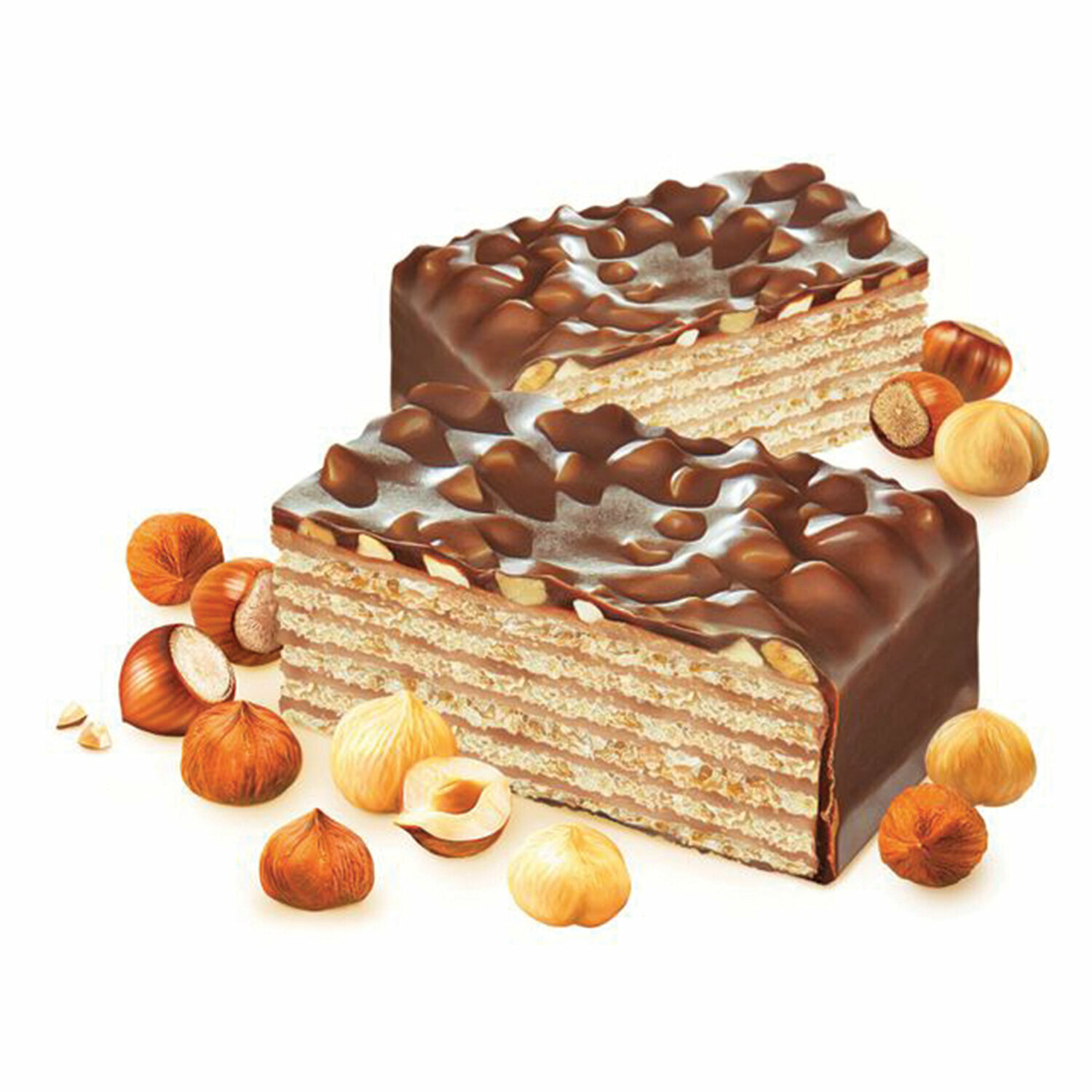 Глазированный вафельный торт спралиновой начинкой спосыпкой изобжаренного дробленого фундука.