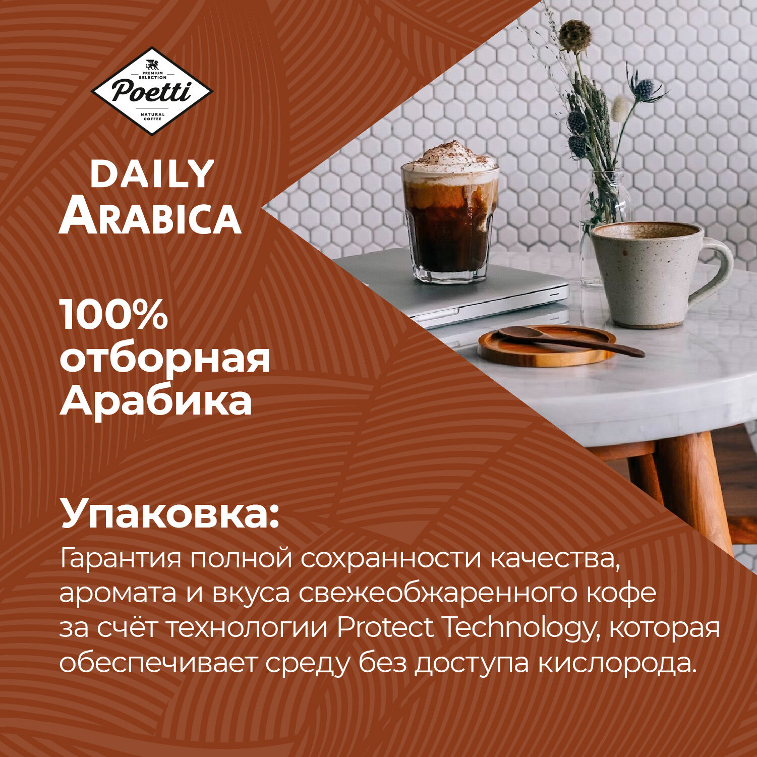 Poetti Daily — это линейка натурального кофе высокого качества на каждый день. Эксперты с многолетним опытом в обжарке кофе и профессиональные бариста разработали бленды, чтобы кофе радовал Вас вкусом и заряжал энергией! Poetti Daily - бодрящий кофе для продуктивного дня. Daily Arabica — это 100% отборная арабика средней степени обжарки со сладким сбалансированным вкусом и ореховым ароматом. Напиток средней плотности раскрывается нотами спелых цитрусов и молочного шоколада. Poetti Daily Arabica — всегда вкусный кофе в каждой чашке! Идеален для приготовления в чашке, френч-прессе, автоматической кофемашине, капельной и гейзерной кофеварке.