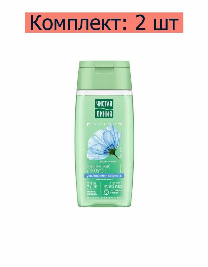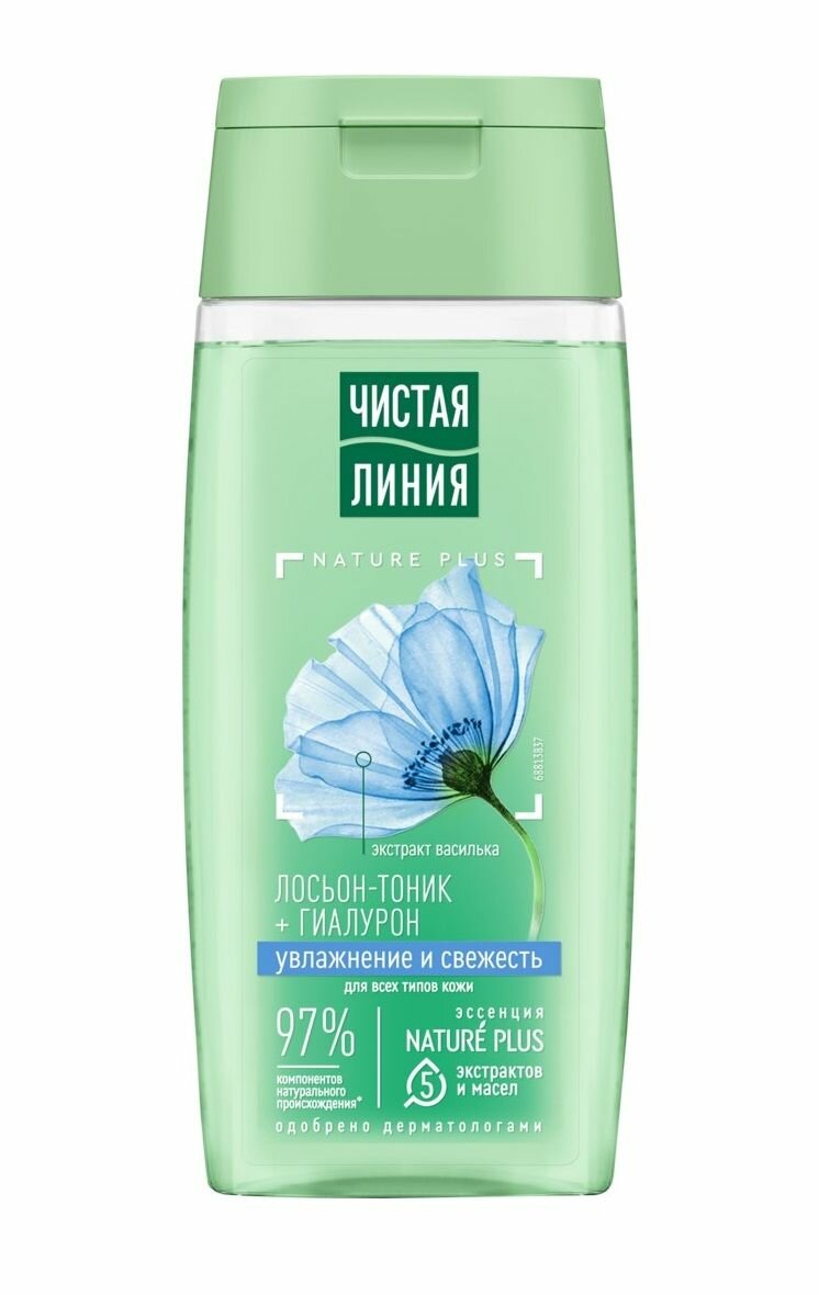 Лосьон-тоник Чистая Линия на отваре трав отлично подходит для всех типов кожи. Он на 97% состоит из компонентов натурального происхождения. Активные ингредиенты лосьон-тоника: эссенция из пяти экстрактов и масел Nature Plus (экстракт вербены, экстракт пиона, масла миндаля, льна, оливы), экстракт василька и гиалурон, увлажняют и тонизируют кожу, подготавливая ее к нанесению крема или базы под макияж. Экстракт вербены восстанавливает баланс увлажненности и тонизирует. Экстракт пиона и льняное масло успокаивают и смягчают. Масло миндаля содержит жирные кислоты, витамины Е и F, питает и выравнивает поверхность кожи. Ферментированное оливковое масло богато природными антиоксидантами, питает и помогает предотвратить преждевременное старение кожи. Гиалурон притягивает молекулы воды, а также создает на поверхности тонкую невидимую вуаль, благодаря чему насыщает влагой и не дает ей испаряться. Экстракт василька тонизирует кожу и повышает ее эластичность. Результат: естественно красивая, увлажненная и сияющая кожа.