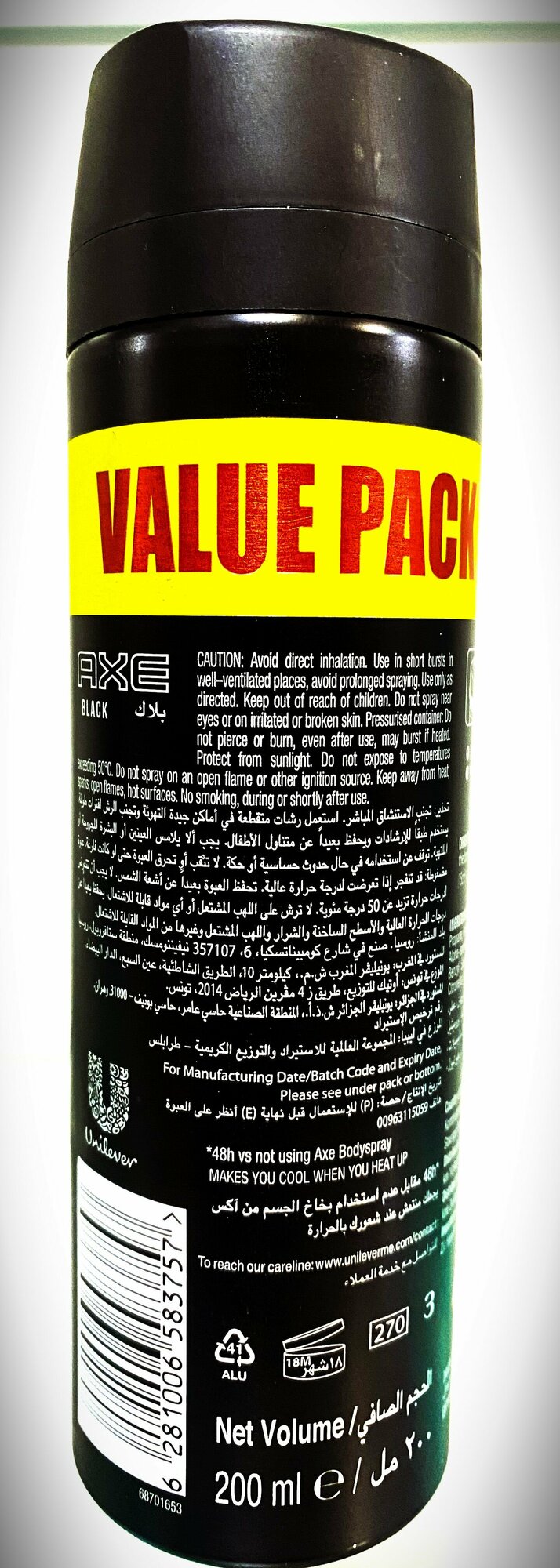 AXE дезодорант-аэрозоль BLACK для мужчин 200 мл обеспечит надежную защиту от запаха пота в течение дня, подарит чувство свежести и доставит удовольствие утонченным и благородным ароматом. Новая технология 2в1. Будь свежим, привлекай ароматом. Парфюмерная композиция была создана модным домом при участии знаменитого мастера Энн Готлиб. Аромат раскрывается сочными нотами морозной груши и кедра. В сердце царят цветочные ароматы водной лилии и фрезии, а шлейф аромата составлен из древесных ноток. AXE дезодорант-аэрозоль BLACK изготовлен с заботой о здоровье и окружающей среде. Безопасная антибактериальная формула препятствует размножению бактерий, вызывающих неприятный запах, и не блокирует потовые железы. Дезодорант позволяет коже свободно дышать и гарантирует невероятно долгую защиту от запаха пота до 48 часов. С ним ваша одежда всегда будет выглядеть чистой и опрятной: продукт не приводит к появлению пятен и разводов как на светлой, так и на темной ткани.