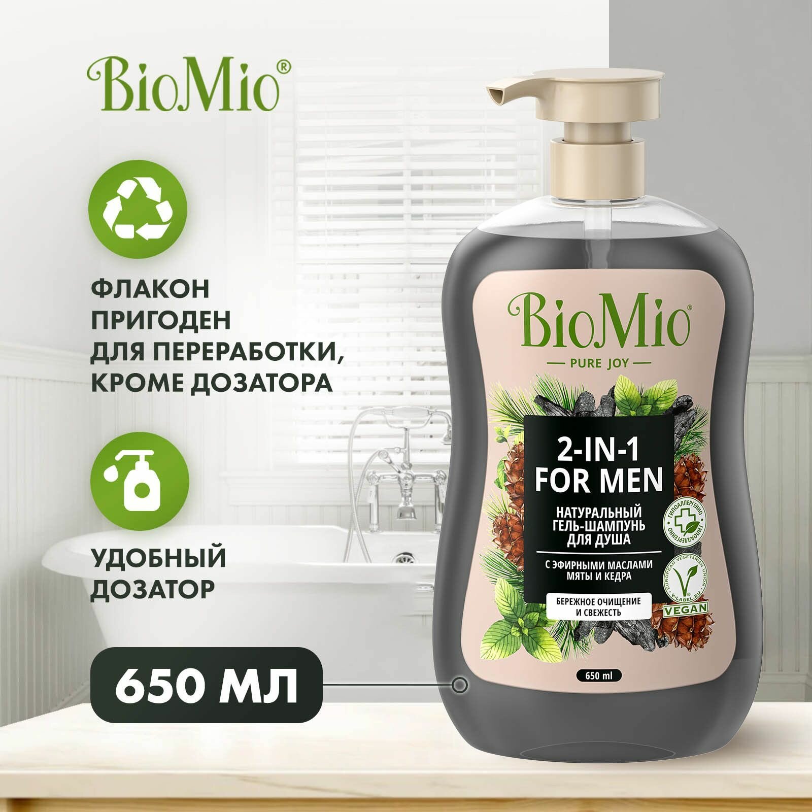 Натуральный увлажняющий парфюмированный мужской гель шампунь для душа BioMio мята и кедр, 650 мл. Освежающие водные процедуры для мужчин с эффектом ароматерапии! Натуральный гель-шампунь для душа 2-IN-1 FOR MEN с углем и эфирными маслами очищает волосы и кожу, поддерживает защитный барьер кожи. Эфирные масла кедра и перечной мяты придают сил и уверенности в себе, приятно освежают тело и охлаждают рассудок. Гипоаллергенная формула геля-шампуня включает в себя 96% ингредиентов натурального происхождения, не содержит синтетических отдушек и красителей, силиконов, SLES, минерального масла, PEG/PPG, ЭДТА, парабенов. Подходит для веганов, т.к. не имеет компонентов животного происхождения (подтверждено сертификатом V-Label). 98% ингредиентов натурального происхождения